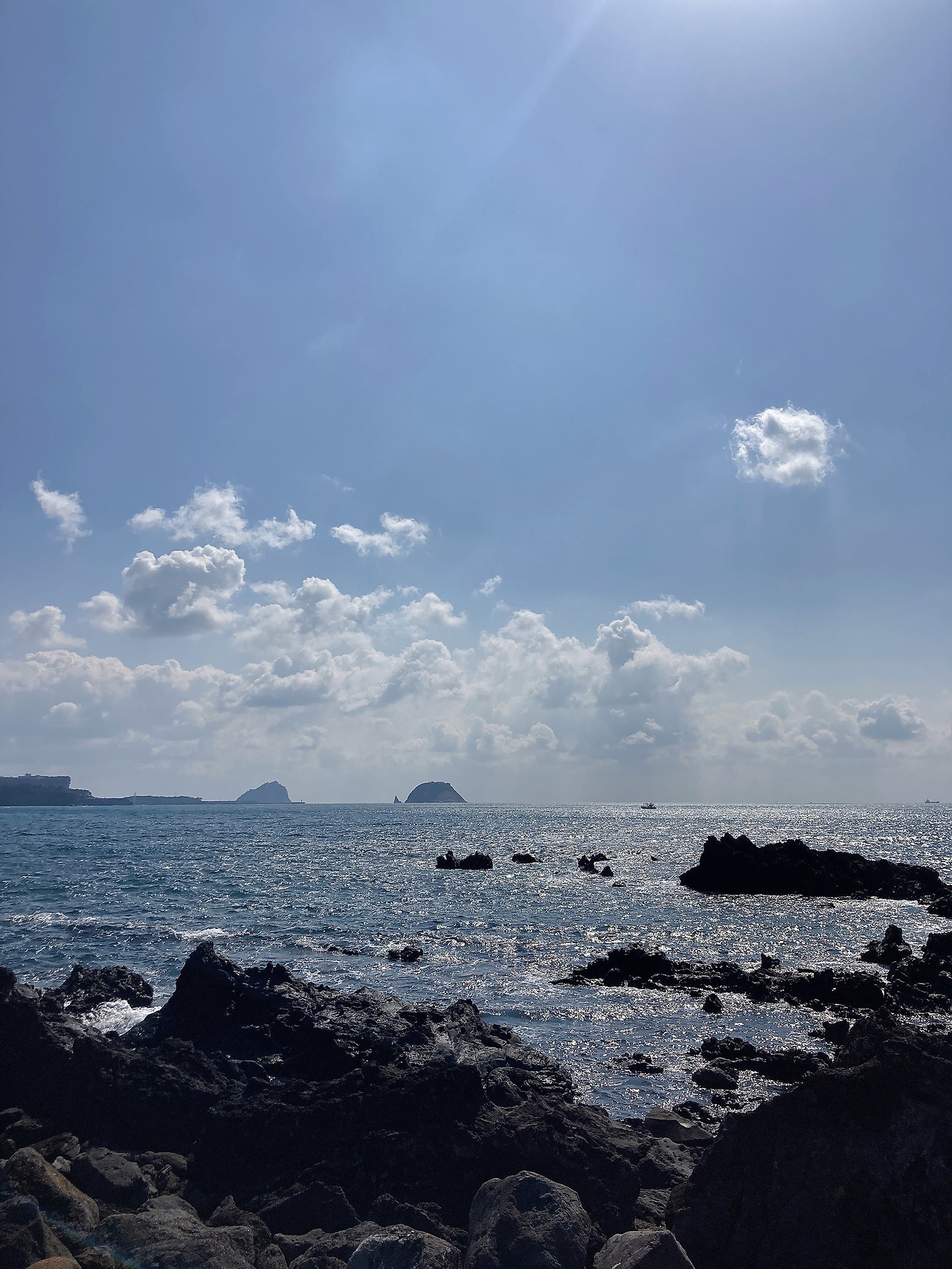 남부에서 매일 2번은 숙소에서 법환포구 쪽으로 이어지는 길로 산책을 갔다. 그 산책길은 좁은 길을 가다 갑자기 등장하는 윤이 나는 바다의 등장으로 이어진다. 파란 하늘에 비친 윤슬 가득한 바다를 예상치 못한 순간에 갑자기 마주했을 때 정말 황홀했다. 안 왔으면 정말 후회했을 만큼 매력적이었다.