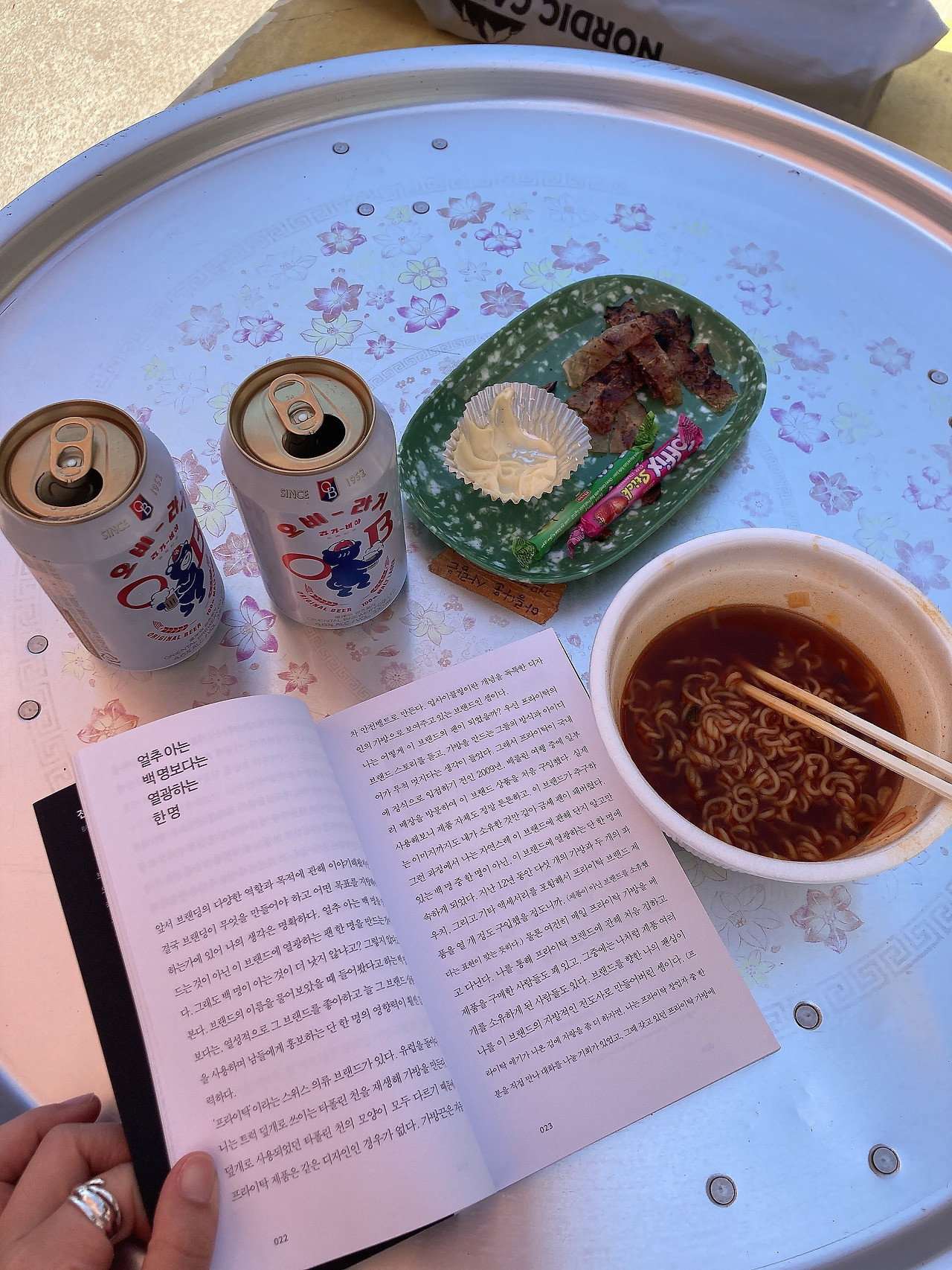 파라솔 우산으로 그늘을 만든 평상에 앉아 가게 냉장고 안쪽에서 꺼낸 맥주 한 캔을 마시는 데 생맥주처럼 신선하고 시원함!! 그렇게 쥐포에 컵라면까지 먹으며 혼술 파티를 했다. 틀어 놓으신 라디오를 들으며 330ml짜리 맥주 2캔을 마시고 알딸딸해지자 낮술을 마무리했다. 내가 2시간 동안 마시고, 책 읽고, 셀카 찍고, 놀고 그 자리를 나가기까지 손님은 나 하나였다. 자리 없을까 봐 걱정한 나의 우려는 기우였다지.