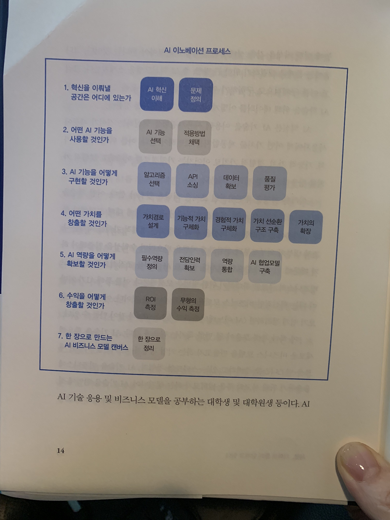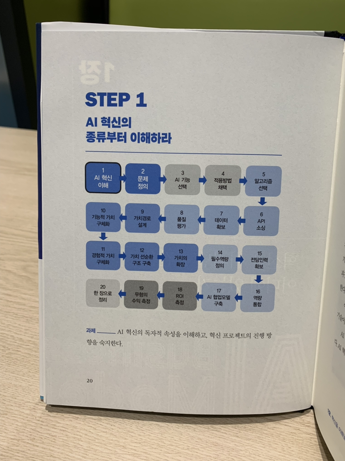 이 책의 가이드라인을 따라가는 방법은 2가지다. 첫 번째는 저자가 제안하는 20단계를 하나씩 밟아가면서 AI 혁신을 이루는 방법이고, 두 번째는 비즈니스 모델 캔버스부터 시작해서 각 영역에 어떤 내용을 채울 것인지 고민하고, 필요한 내용을 찾아보는 방법이다.