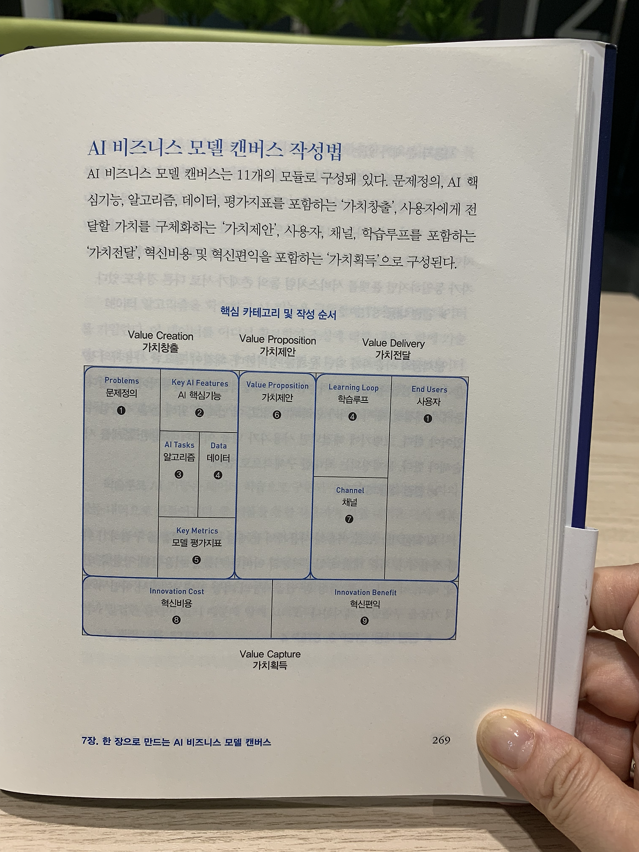 저자는 이 책에서 기존 비즈니스 모델 캔버스를 AI 혁신에 맞게 새롭게 정의했다. 기존 비즈니스 캔버스와 다르게 AI 비즈니스 모델 캔버스는 11개의 모듈로 구성된다. 문제정의, AI 핵심 기능, 알고리즘, 데이터, 평가 지표를 포함하는 '가치 창출', 사용자에게 전달할 가치를 구체화하는 '가치 제안', 사용자, 채널, 학습루프를 포함하는 '가치전달', 혁신 비용 및 혁신 편의를 포함하는 '가치 획득'으로 구성된다.