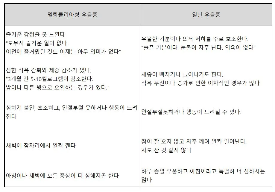 한국인의 경우 멜랑콜리아형 우울증이 많다. 이 형태의 우울증은 자신의 감정을 못 느끼고 무척 예민한 특징을 가지고 있다.