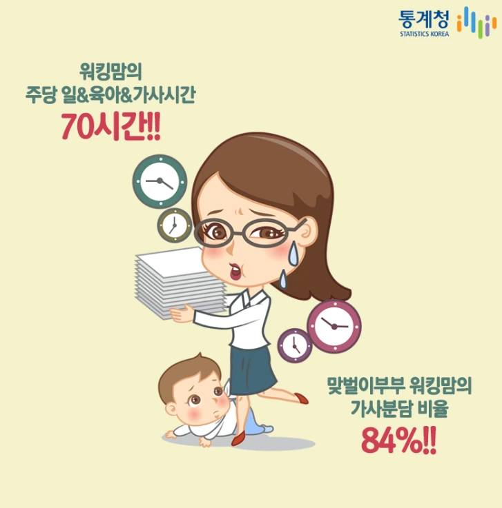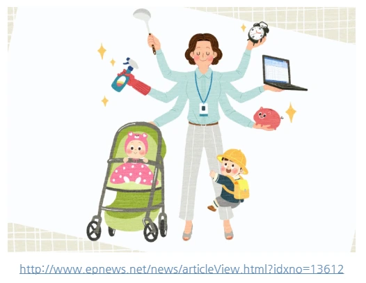 그때마다 생각한다. 남자들은 직장만 다녀도 힘들다고 난리인데, 워킹맘들은 가사, 육아에 직장생활이 더해진다. 저글링 공이 3개다. 아니다 3개라고 하면 너무 많다. 가사는 포기하자. 직장과 육아 둘만 해도 할 말이 많다.