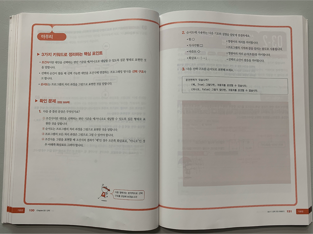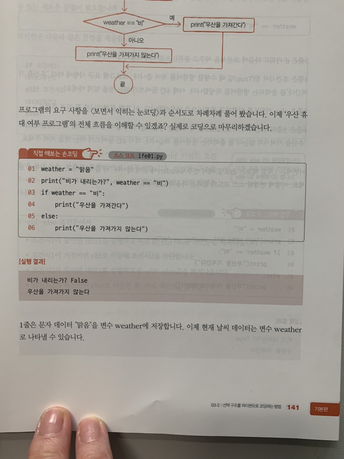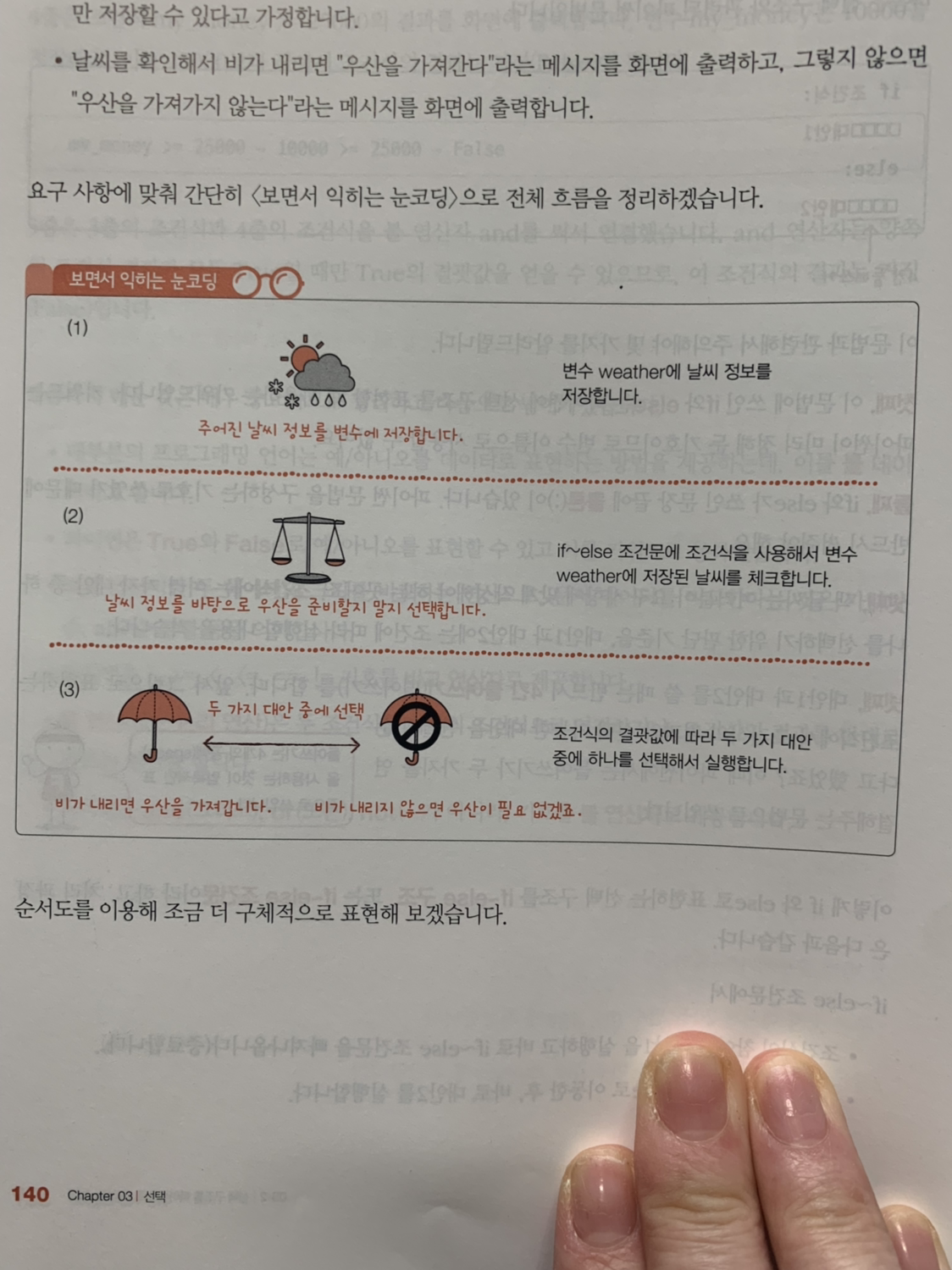 가장 인상적인 부분은 조건식에서 순서도에 대한 설명이다. "일기 예보를 믿고 우산을 가지고 나가려니 왠지 비는 내리지 않을 것 같고, 안 가지고 나갔는데 혹시 비가 내리면 어떡하지?"라는 상황을 프로그램으로 작성해가는 순서를 설명한다.