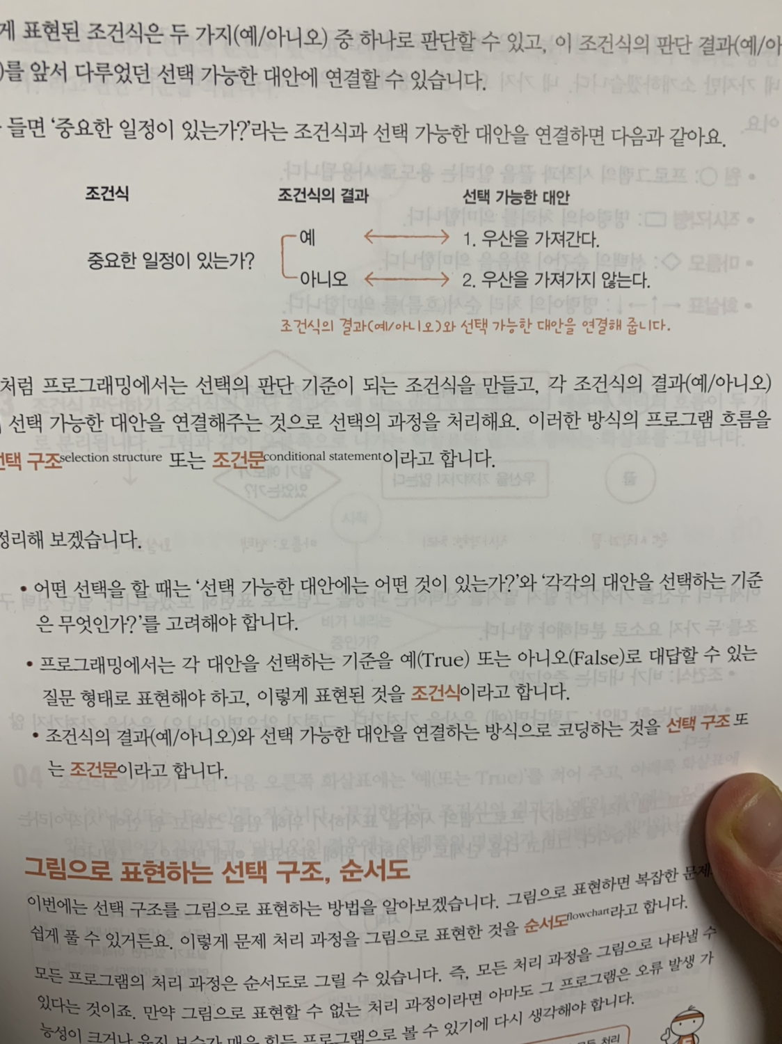 "이처럼 프로그래밍에서는 선택의 판단 기준이 되는 조건식을 만들고, 각 조건식의 결과(예/아니오)에 선택 가능한 대안을 연결해주는 것으로 선택의 과정을 처리해요. 이러한 방식의 프로그램 흐름을 선택 구조 또는 조건문이라고 합니다."