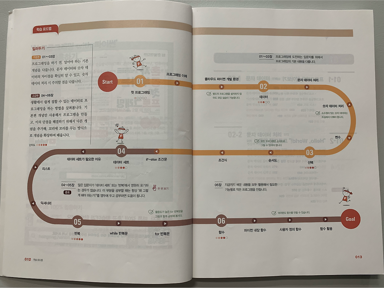 학습 로드맵을 보면 개발 환경, 데이터, 연산식, 변수, 조건식, 데이터 세트, 반복 등 프로그래밍에 필요한 내용들이 다 들어있다.