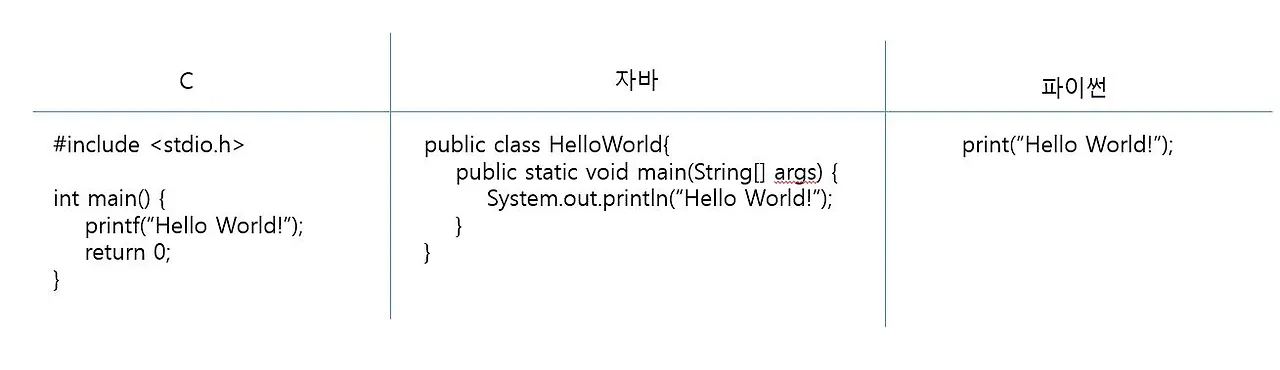 프로그래밍 처음 배울 때 'Hello world'부터 배운다. C와 자바, 파이썬 세 언어로 짠 'Hello World'를 비교해보면 어떤 언어가 간결하고 쉬운지 금세 알 수 있다. 요즘 머신러닝과 관련해 인기 있는 프로그램인 텐서플로, 넘파이, 판다스 등도 파이썬으로 작성되었다.