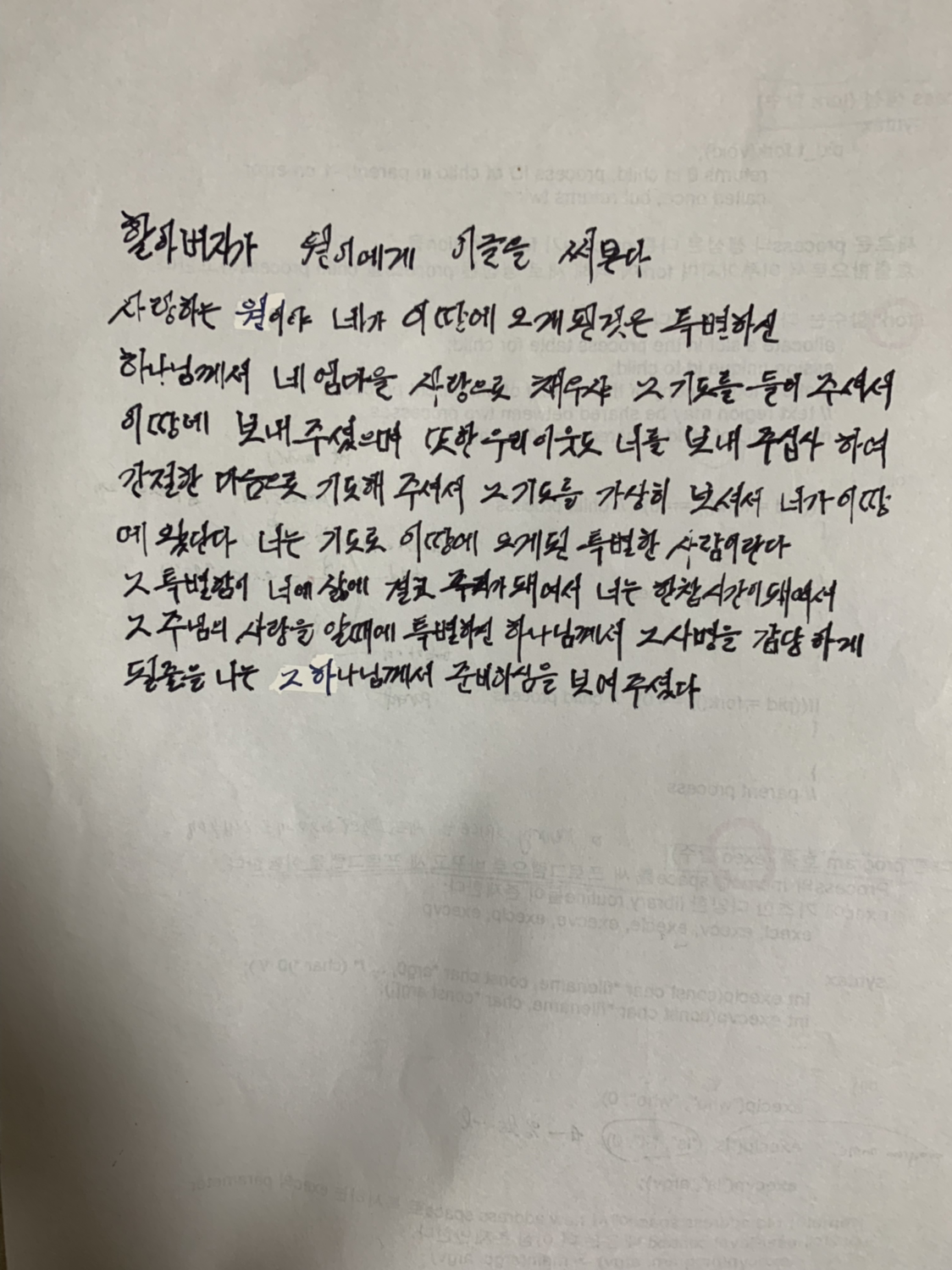 그런 아빠는 손녀에게도 보내지 않을 편지를 가끔 쓰신다. 아빠는 필사를 좋아하셔서 늘 성경을 쓰시는데, 이면지에 쓰신 여러 글 중에 손녀에게 쓰신 글을 우연히 발견했다. 아빠가 전하는 글 속의 사랑은, 말로 하는 사랑보다 훨씬 더 깊고 오래 울린다.