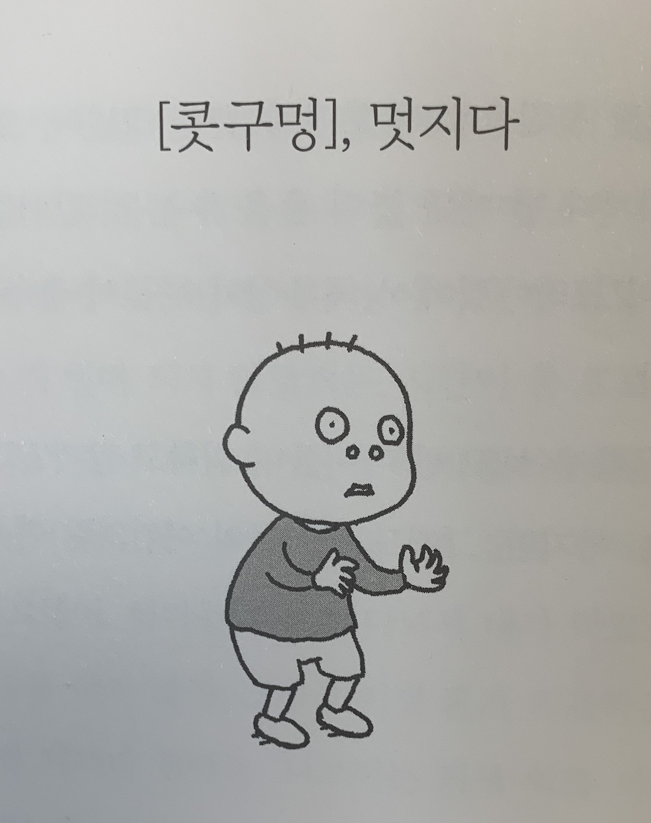 그중 '[콧구멍], 멋지다'는 아이가 휴지를 돌돌 말아서 콧구멍에 넣어서 생기는 이야기다. 혼자서는 못 빼서 발을 동동 구르고 있는데, 마침 신문 대금 받으러 온 형이 젓가락으로 휴지를 빼준다. 형도 어렸을 때 코에 은박지를 넣다가 겨우 뺐는데, 은박지 뒤에 도토리가 딸려 나왔단다. 함께 깔깔 웃으며 아이는 말한다.