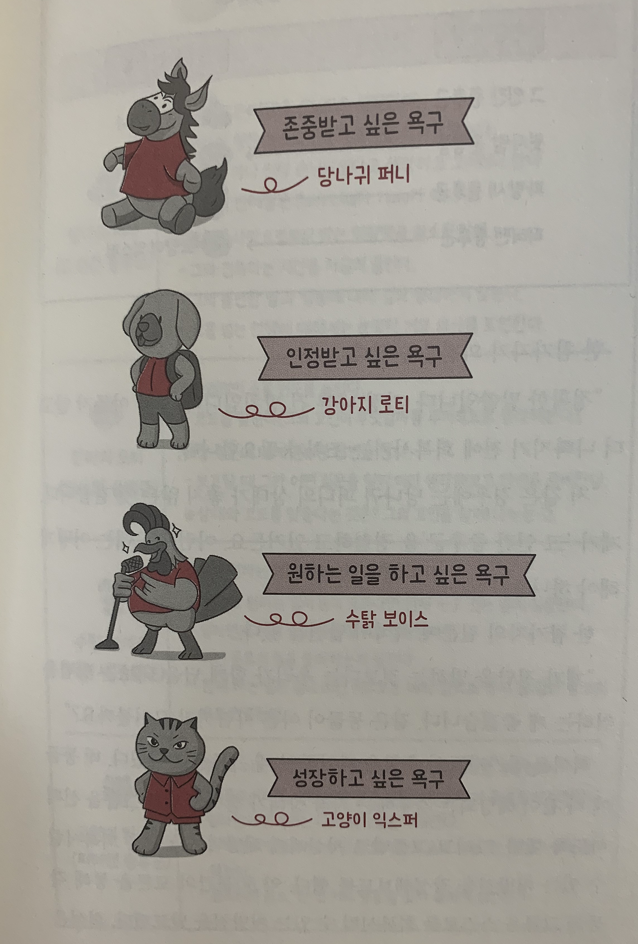 저자는 영화 <<인사이드 아웃>>(픽사, 2015)의 기쁨, 슬픔, 버럭, 까칠, 소심의 다섯 감정처럼 우리 안의 심리적 욕구를 '네 가지 동물'로 표현했다. 그리고 이 동물을 제대로 보살피지 않았기 때문에 우리가 내면적 자기 퇴직 증후군을 가지게 되었다고 설명한다.