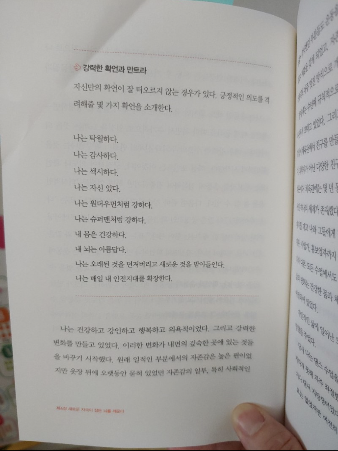 저자는 자신의 성장 스토리와 뇌 과학 이론을 연결해서 설명한다. 이야기를 따라가다 보면 그녀의 성장과 더불어 우리의 뇌 과학 지식도 함께 성장하는 느낌이 든다. 뇌 과학의 이야기를 이렇게 친밀한 방식으로 소개하는 저자는 처음이라 신선했다. 과학 교양서인데 마치 소설 같다. 이 책을 읽으면서 그녀처럼 낯선 곳에 가서 살아보고 싶었고, 연애 이야기에 같이 공감했다. 무엇보다 몇 번이나 읽다 말고 밖에 나가 뛰고 싶었다. 작가의 경쾌한 말투와 운동 펌프질이 운동을 좋아하지만 바쁘다는 핑계로 못하고 있었던 내게 강렬한 자극을 주었다. 그 결과, 그동안 안 하고 있었던 아침 스트레칭을 다시 시작했다. 동작이 많지도 않고 길어야 5분도 안되는 시간이지만 스트레칭을 통해 전보다 조금 집중도가 높아졌다.