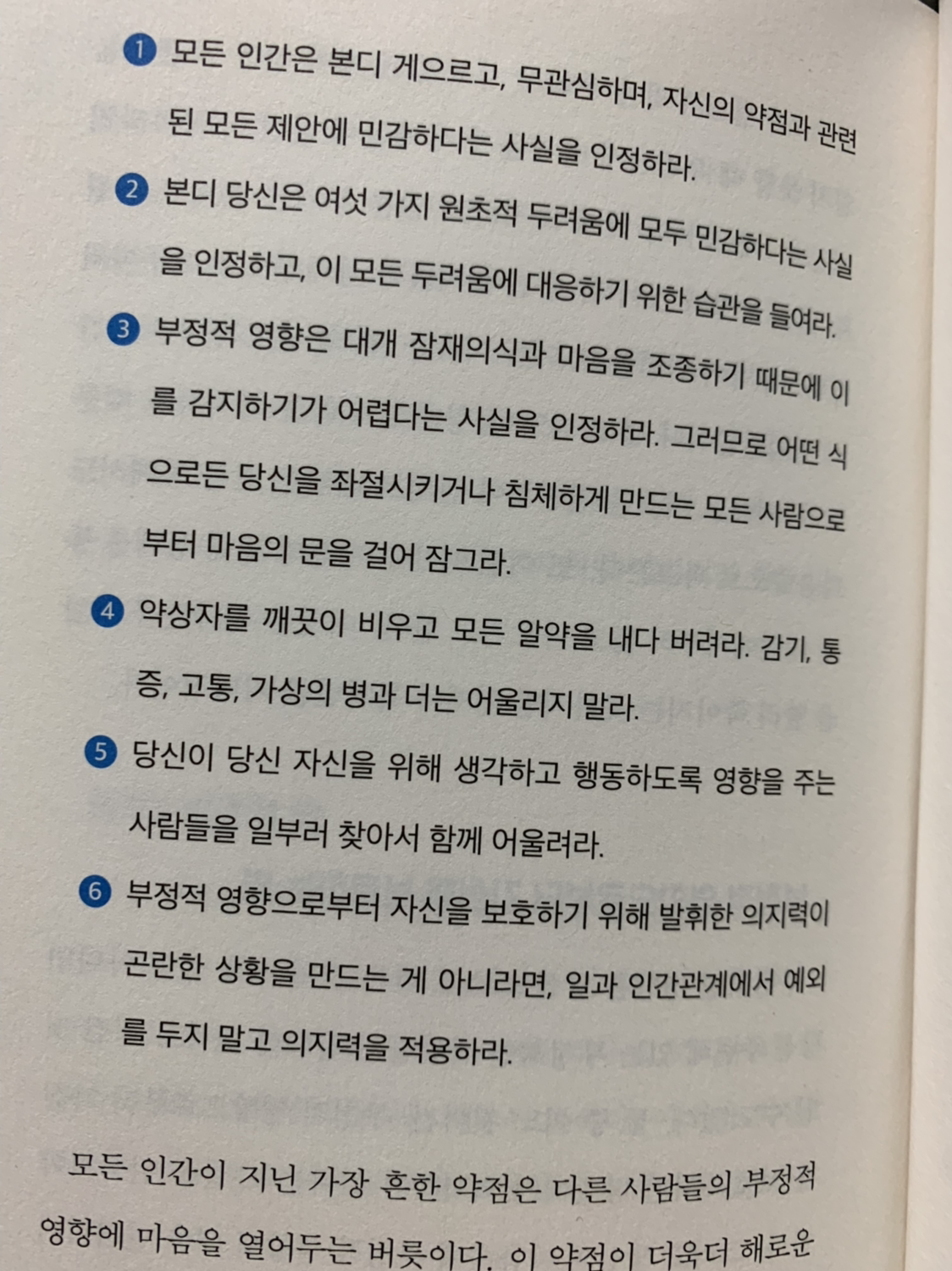 가난에 대한 두려움, 비판에 대한 두려움, 건강 악화에 대한 두려움, 실연에 대한 두려움, 노화에 대한 두려움, 죽음에 대한 두려움 죽음이라는 6가지 원초적 두려움을 극복하라. 두려움을 극복하기 위해서는 그 원인을 알아야 하고, 이는 자기 자신을 잘 안다는 것을 의미한다.