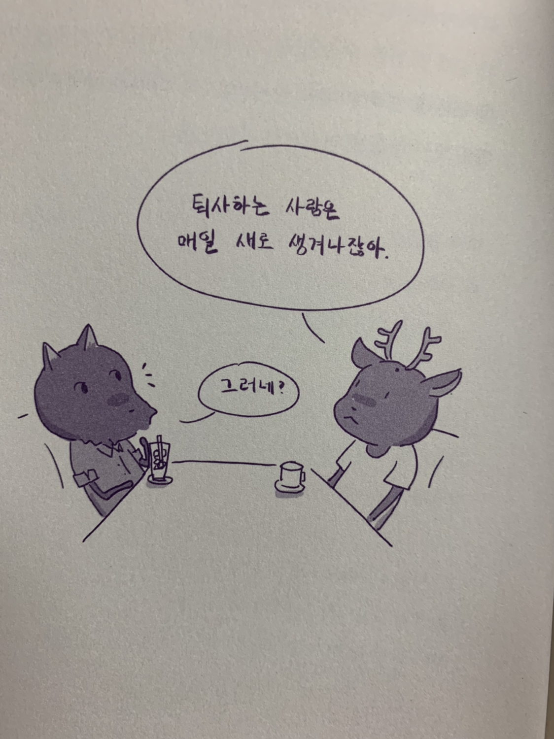 이 대목은 정말 공감했다. 퇴사 후 회사를 가지않았을 때 나는 어느 박제된 시간에 갖힌 기분이 들었었다. 이질적인 존재로.