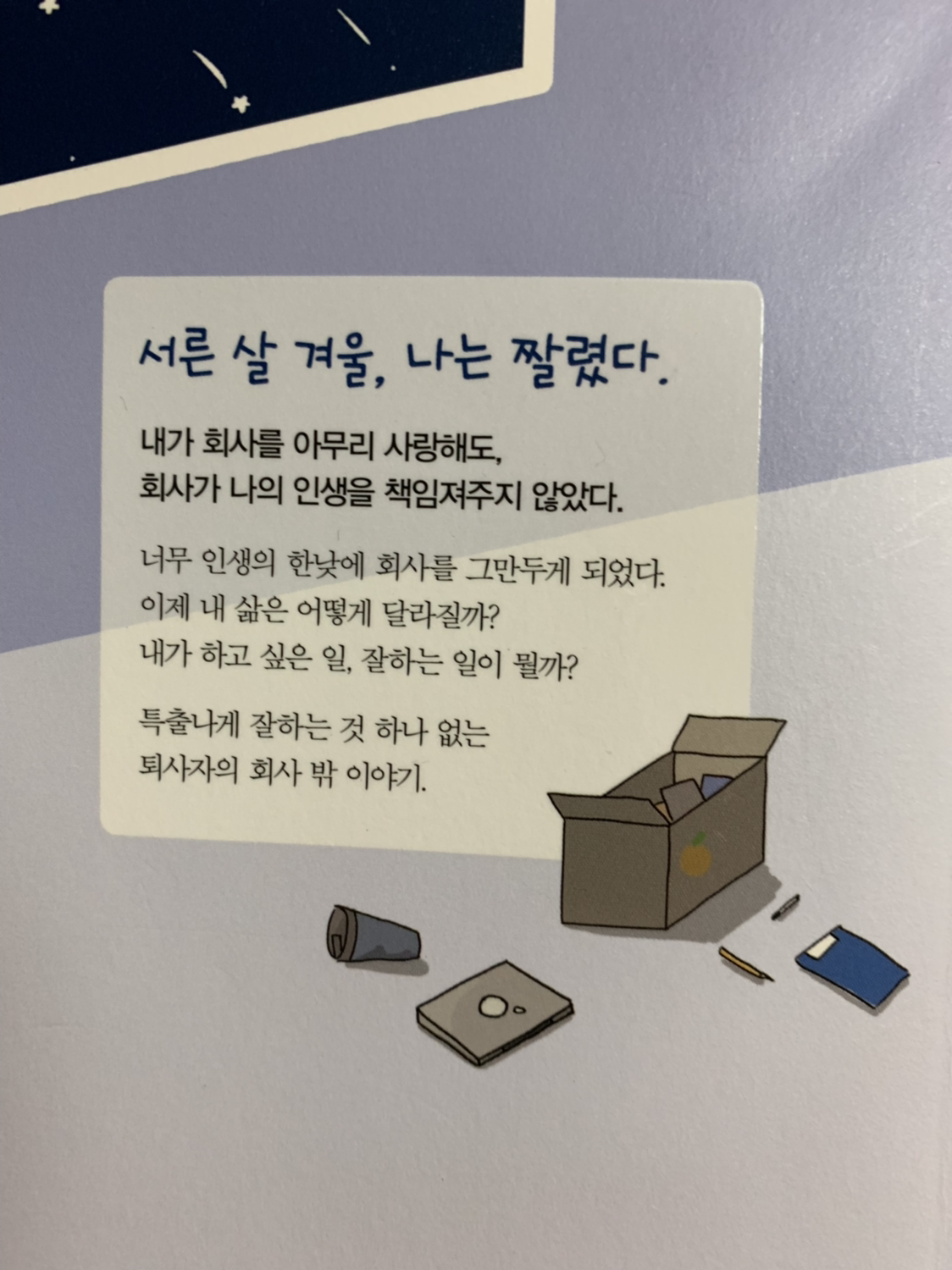 저자는 덤덤하게 회사를 나온다. 그 이야기를 하나의 드라마 혹은 에피소드처럼 그려낸다. 너무 질척거리지도 않지만, 너무 건조하지도 않다. 아주 적당한 수준을 지키면서 담담하게 그려냈다.