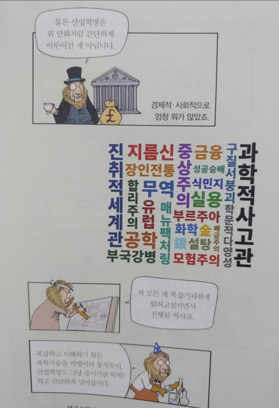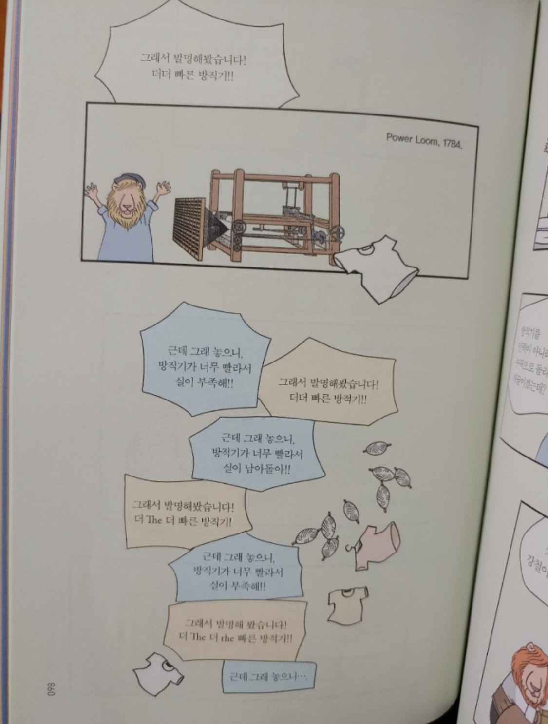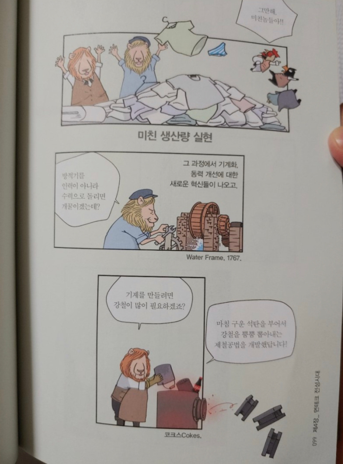 면화를 수입해 영국에서 직접 면직물을 만들기 위해 방직기, 방적기를 만들게 되었고, 생산량이 급증하게 되었고, 생산량 향상을 지원하기 위해 다양한 기계가 나오고, 기계를 만들기 위한 제철 공법이 발달하게 되고, 코크스 공정을 쓰기 위해 석탄이 필요하고, 석탄 캘 때 나오는 지하수를 퍼내기 위해 증기기관 펌프가 개발되고, 기어, 크랭크의 발전으로 증기기관은 모든 기계의 동력 장치가 되었고... 꼬리에 꼬리를 무는 혁신과 생산 증대는 부를 가져오고, 이는 다시 재투자를 가져오고, 결국 산업혁명이 되었다는 것이다. (쓰다 보니 문장도 길다.) 물론 이해하기 쉽도록 강조한 것이긴 한데, 쉽게 와 닿긴 했다.