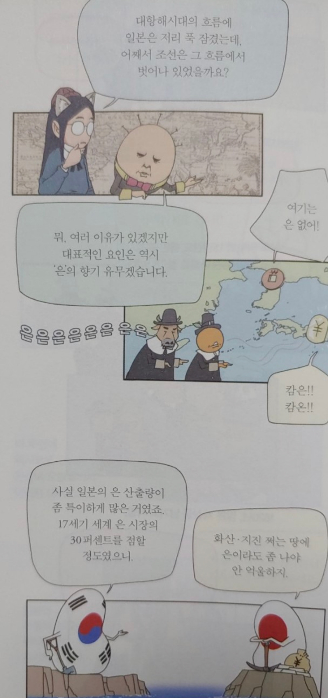 <<본격 한중일 세계사>>에 따르면 대항해시대에 한국이 제외된 이유는 한국의 은 생산량이 많지 않아서라고 한다. 반면 일본은 전 세계 은 시장의 30%를 차지할 정도로 엄청난 양의 은을 유통했다고 한다. 17세기 조선의 은 생산량을 검색하다 일본이 은을 많이 생산하게 된 것은 조선의 덕도 있었다는 사실을 알게 되었다.