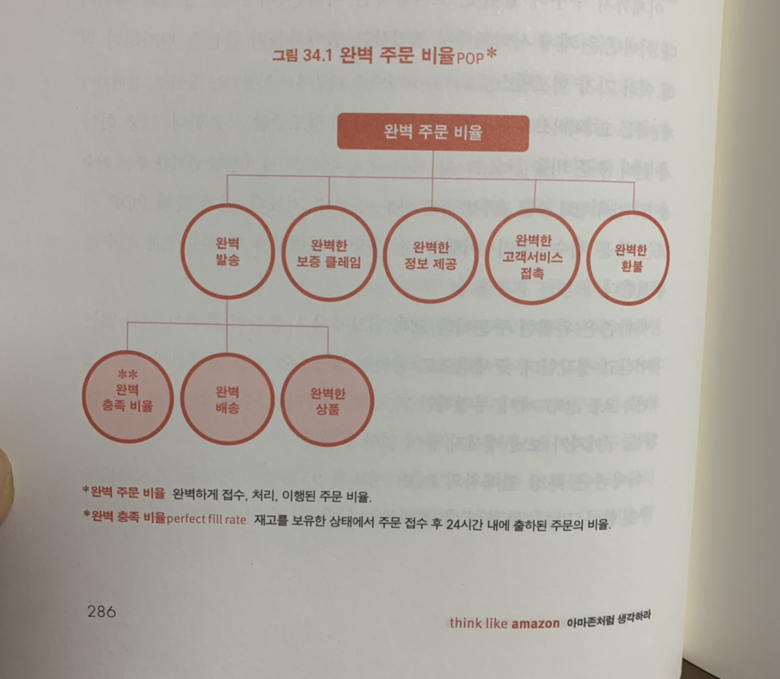 한 예로 아마존에는 완벽 주문 비율(perfect order percentage, POP) 지표가 있다고 한다. 90일 동안 전체 주문 건수 중 완벽한 주문 건수의 비율이다. 아마존에서 말하는 사용자 입장에서 전혀 불편함이 없는 주문은 A-to-Z 보증 클레임이 없고, 부정적인 피드백이 없고, 지불 거절, 주문 취소, 배송 지연, 환불, 구매자가 보낸 메시지가 없는 것을 의미한다. 부정확한 리스팅, 배송 지연, 배송추적 정보 누락, 취소된 주문 등을 제거하고 최고의 서비스를 제공할 수 있도록 한다. 표준적인 고객 경험을 구축하고, 고객 경험을 측정할 방법에 모든 기술적인 방법을 동원한다. 고객에게 '쉬운', '완벽한'이란 무엇인지 끊임없이 고민하고, 측정한다. 측정 지표란 이런 것이다라고 알려주는 것 같다.