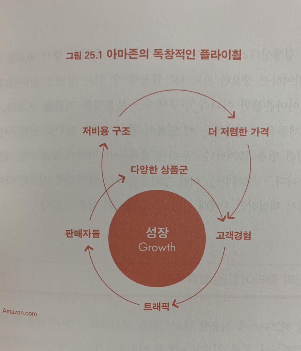저렴한 가격과 멋진 고객 경험에서 시작해서, 고객 트래픽이 많아지면 판매 증가가 되고, 제삼자 판매자가 더 많아지면 웹사이트를 운영 서버 같이 고정비용이 증가하게 되고, 이를 효율화하기 위한 운영 효율성이 개선 노력이 생기고, 효율성으로 얻게 되는 이익은 다시 가격을 내릴 수 있고, 더 많은 상품을 준비할 수 있게 되는 아마존의 플라이휠. 이 휠이 잘 돌아가기 위해서는 장기적인 안목과 휠의 각 요소 간의 마찰을 줄이기 위한 노력을 하는 아마존. 이 책을 읽고 아마존의 플라이휠이 우리를 어디로 데리고 갈지 궁금해졌다.