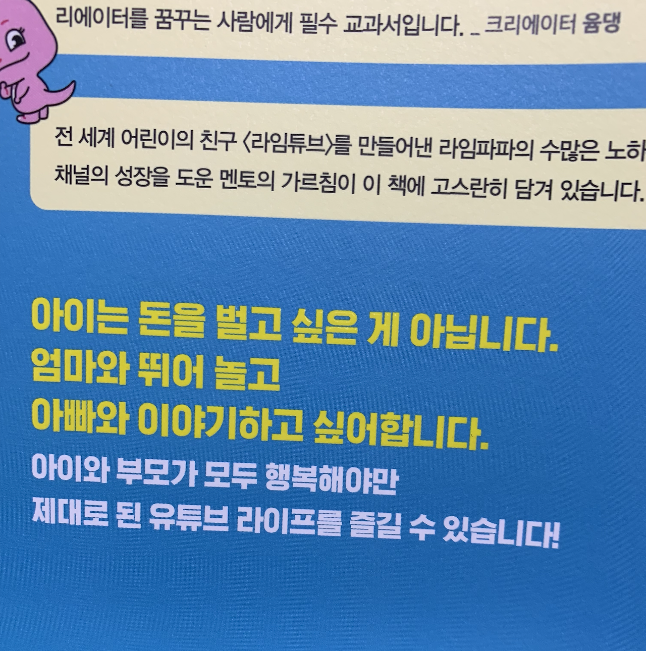이 책은 제목에서 알 수 있듯이 '우리 아이'를 유튜브 스타로 만드는 방법에 대해 설명한다. 이것만 하면 구독자 천명, 우리 아이도 유튜브 대스타! 이렇게 할 수 있는데, 아이가 들어가서인가 아버지인 저자는 조심스럽다. 그리고 라임이를 배려한다. 그런 모습은 책의 내용에도 곳곳에 보인다. 책 서문에 라임파파의 한마디가 인상적이다.