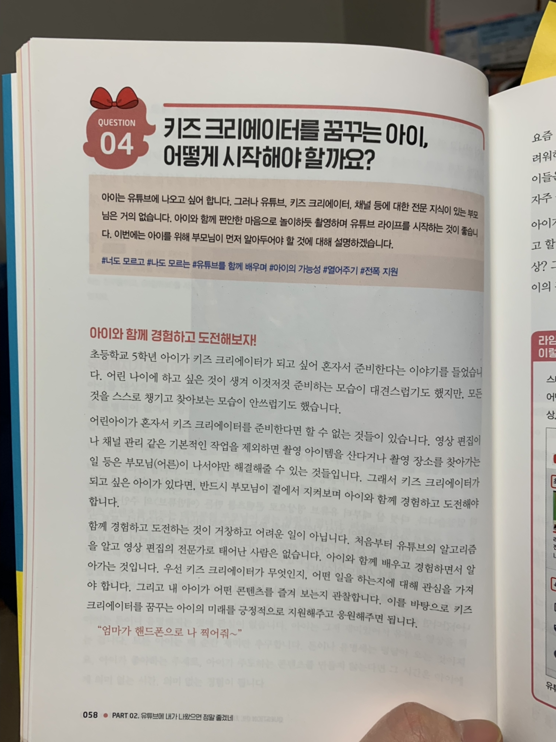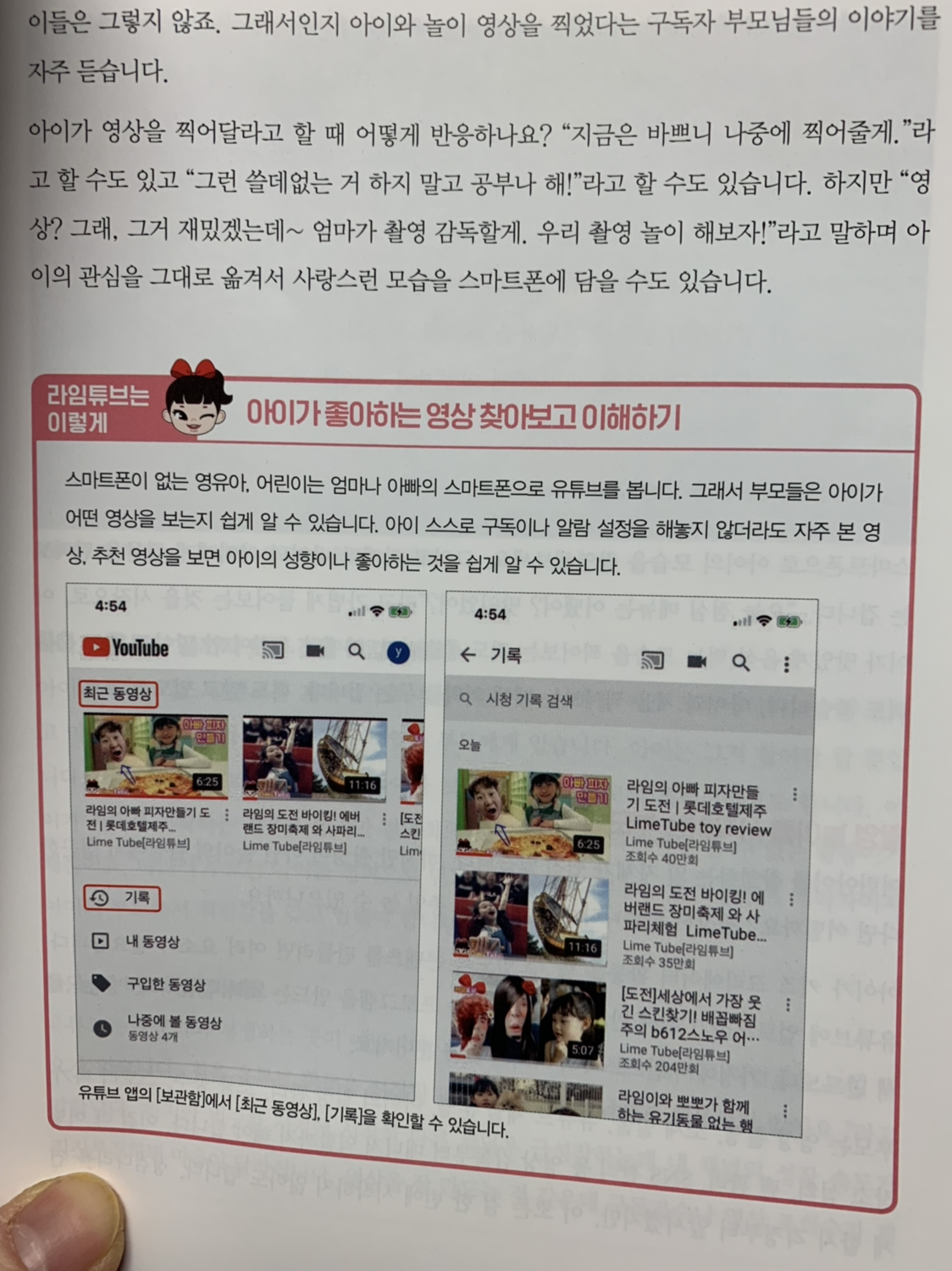 이 책은 키즈 크리에이터로 아이를 키우고 싶은 부모들이 주로 할 만한 질문과 이에 대한 답들로 구성되어 있다. 질문 모두 정말 궁금한 것들이며, 이런 상황을 라임이와 라임파파가 어떻게 헤쳐 나왔는지 알 수 있다.