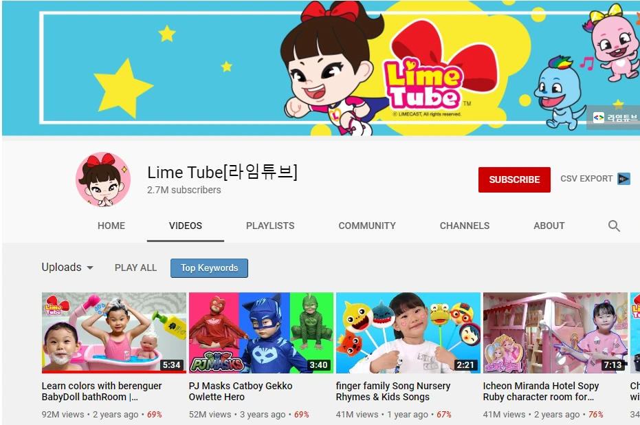가장 인기 있는 영상은 92M 뷰를 달성한 "Learn colors with berenguer BabyDoll bathRoom | Playground Family Fun for Kids"이다. 놀이터에서 아빠랑 재미있게 놀고 와서 씻는다는 스토리다. Baby Green Finger에서 협찬을 받은 듯하다. 라임이가 스스로 머리 감는 모습이 나온다. 책에 나온 파랑이도 나와서 이야기하고, 구독자들과 소통을 위해 "혼자 목욕할 수 있나요? 댓글로 남겨주세요."라고 묻기도 한다. 아기 인형을 목욕시키면서 인형과 장난감도 보여준다. 중간중간 제품 홍보도 아주 자연스럽다. 뒤에 이벤트까지. 아마 이벤트가 있어서 더 인기가 많은 영상일지도 모르겠다.
