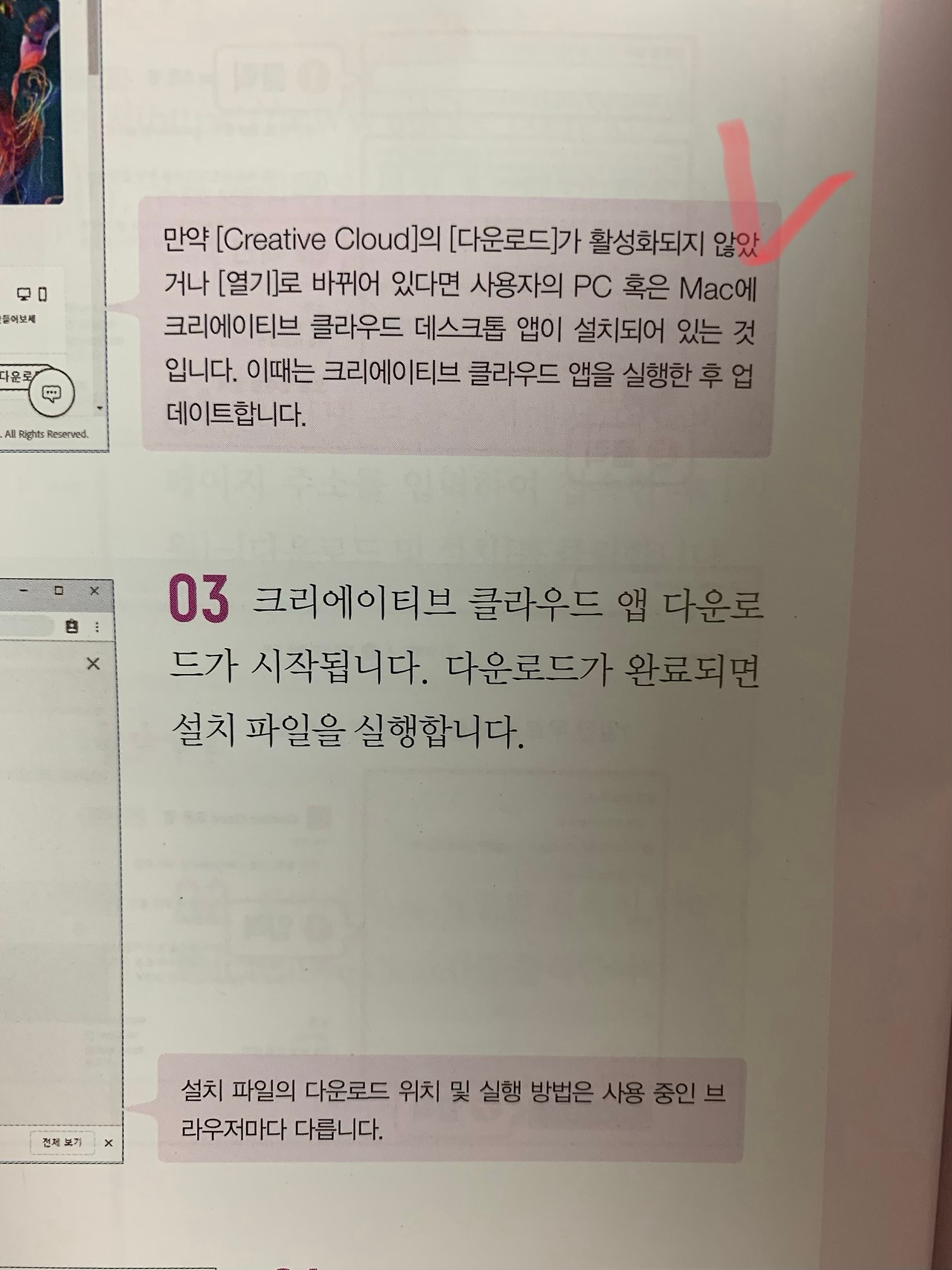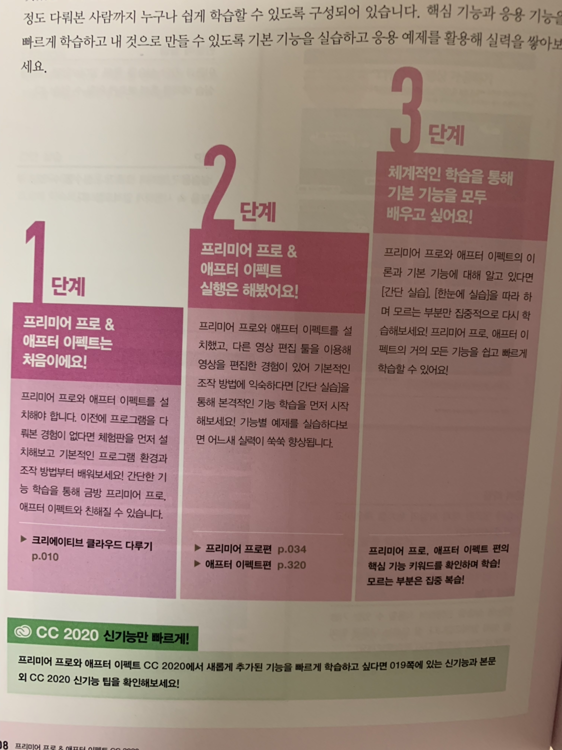 이 책은 확실히 성의 있게 만들었다는 느낌이 든다. 디자인에 대한 책이라 더 신경을 쓴 것 같다. 각 단계별 설명이 한눈에 보이게 잘 정리되어 있으며, 실습과 도구 설치, 실습 시 예외 상황에 대한 대처는 어떻게 해야 할지까지 고민해서 안내한다. 또한 CC 2020 신기능의 특성을 일목 요연하게 정리해서 알려준다.