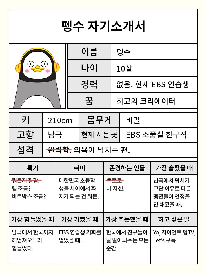 EBS는 펭수의 세계관을 적극 알리기 위해 홈페이지에 자기소개서를 정리해서 올려두기도 했다. 자기소개서에서는 주제곡에서는 드러나지 않았던 나이와 현재 사는 곳이 추가되었으며, 헤엄을 쳐서 왔다는 사실과 존경하는 인물(나 자신) 등이 언급된다.