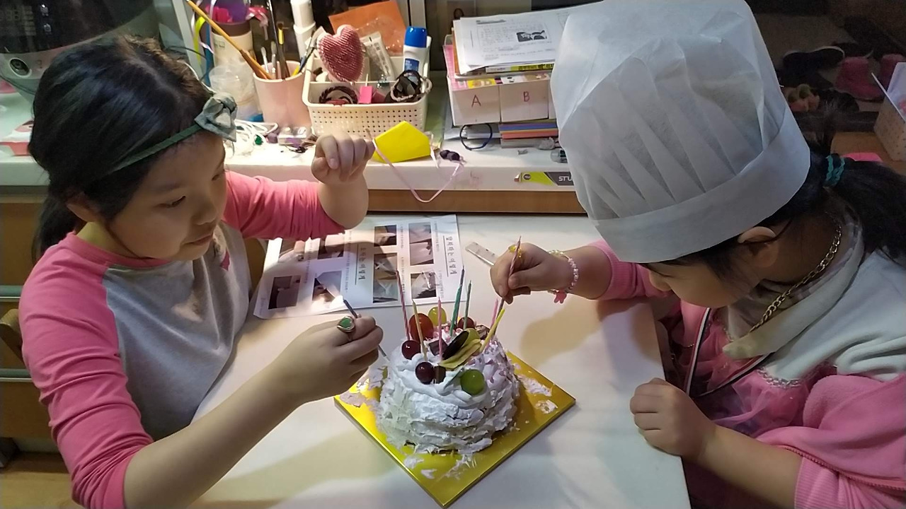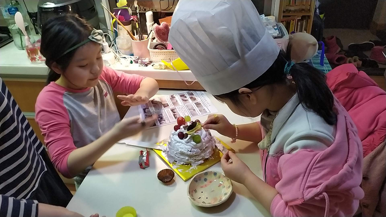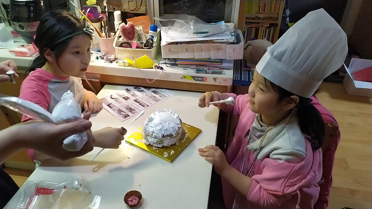 동그란 카스텔라 시트에 짤주머니에 가득 담긴 생크림 그리고 초콜릿, 아몬드 슬라이스, 건포도에 케잌 띠, 촛불까지 포함된, 집에서 아이들 힘으로 케잌을 완성시킬 수 있는 구성이다.