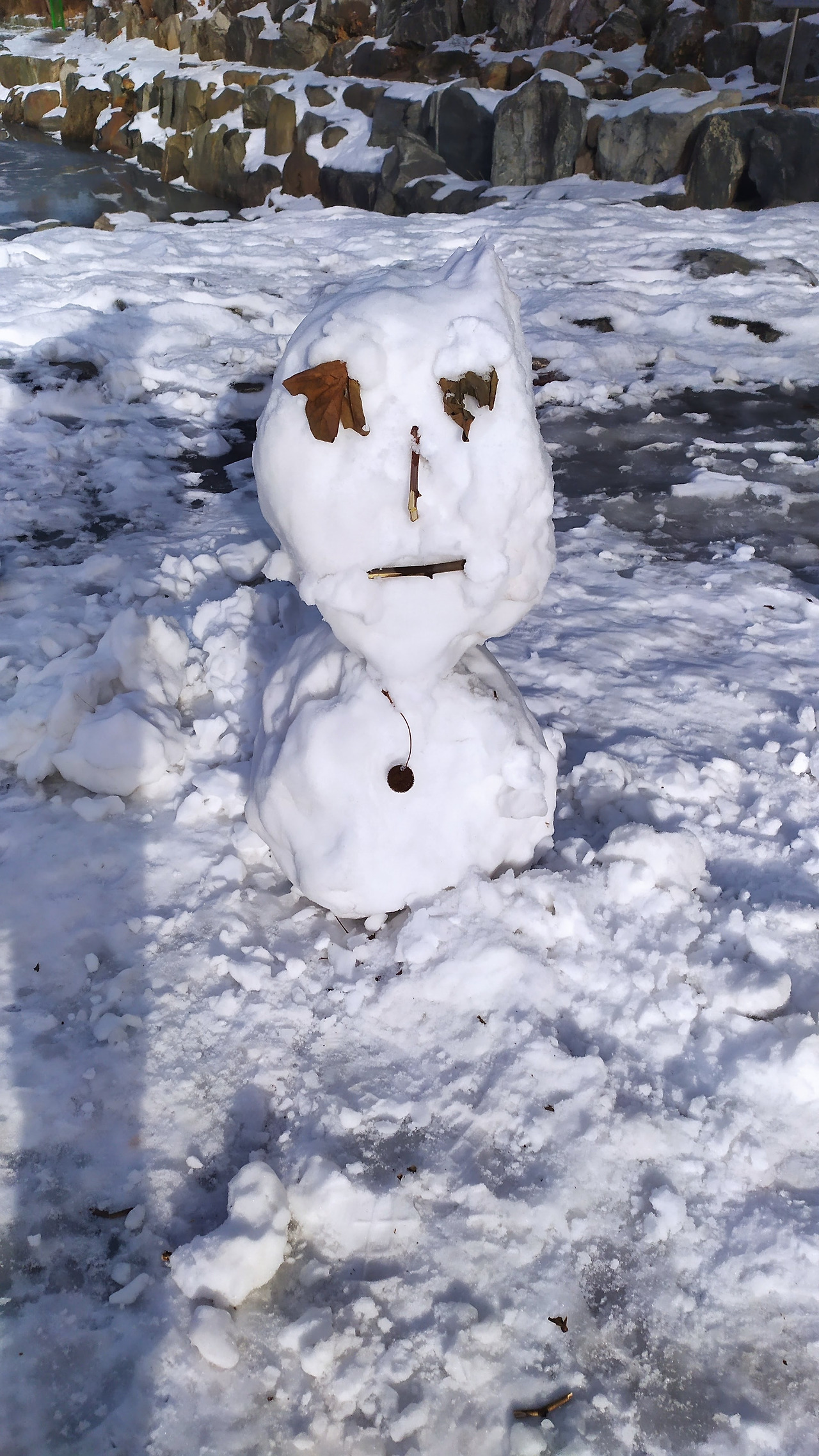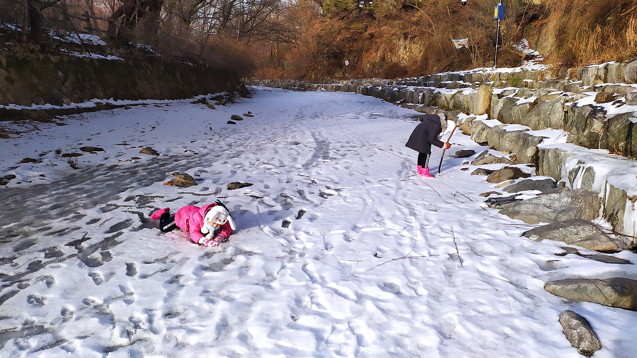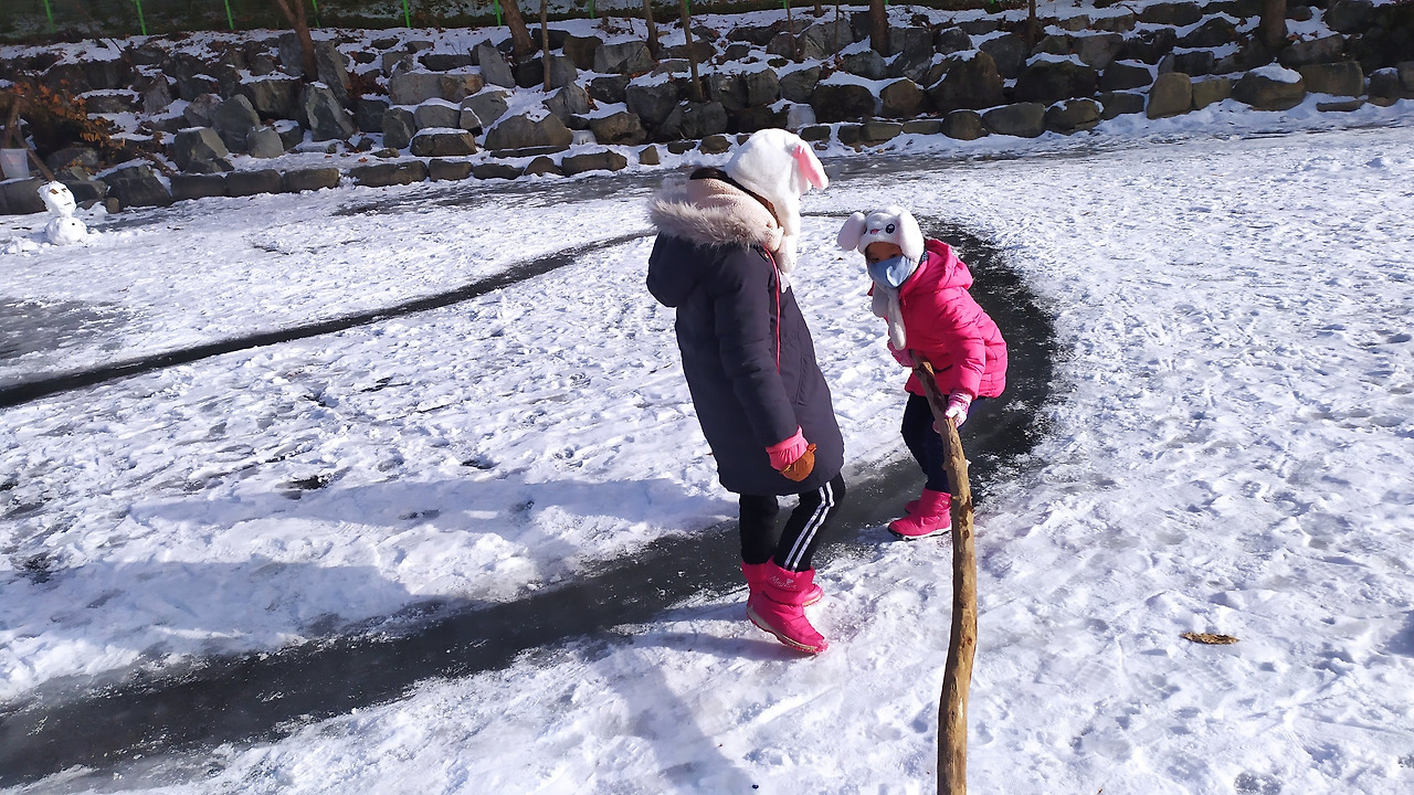 벌써 녹아내리는 얼음판이 못내 아쉬운 아이들. 몰라보게 홀쭉해진 눈사람이 안쓰럽다.