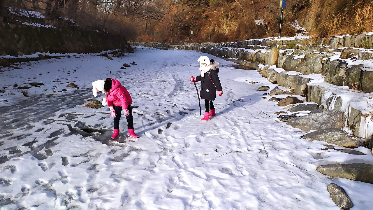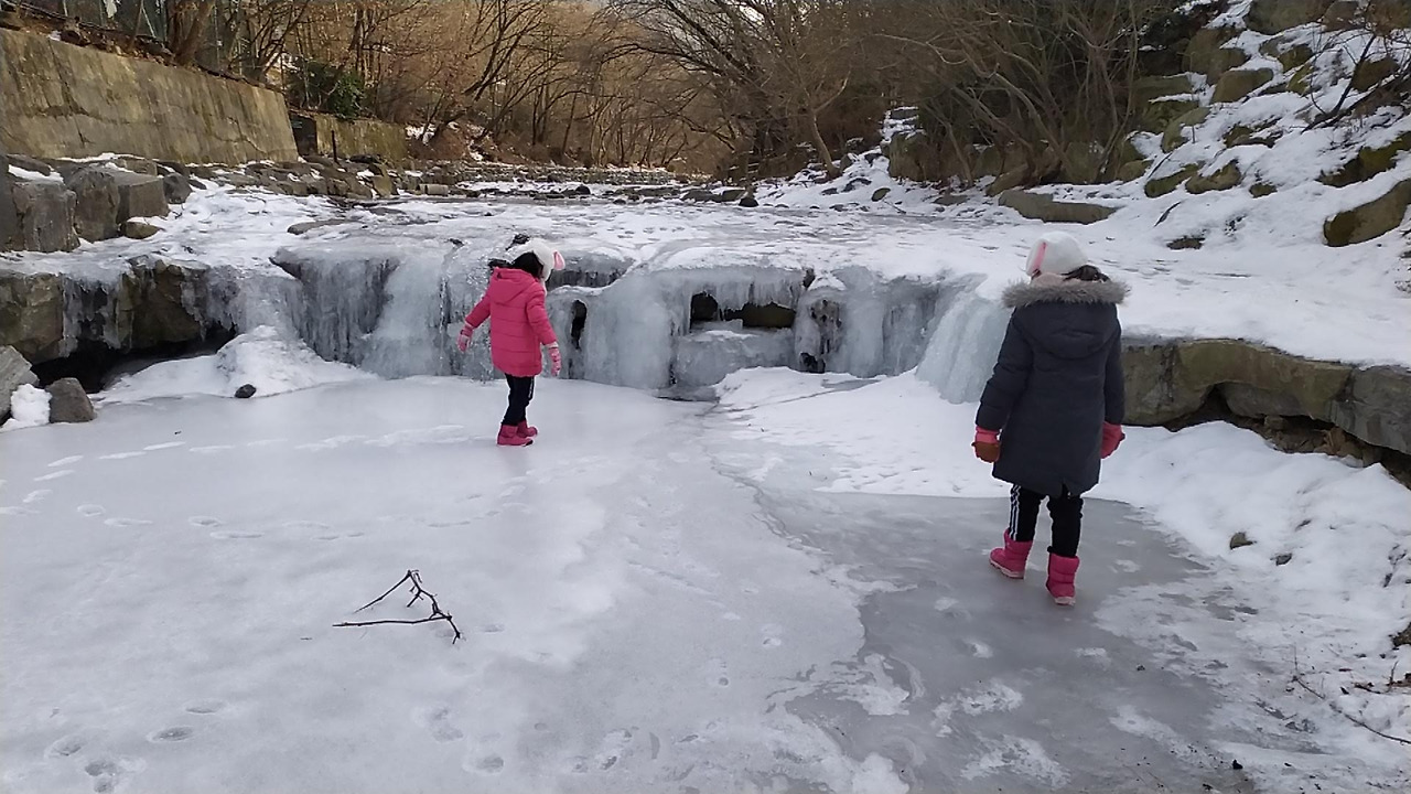 아이들이 빙판 위 발을 디뎠다가
