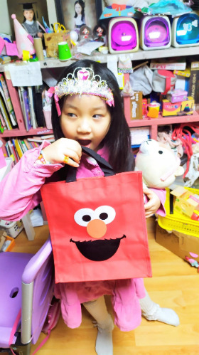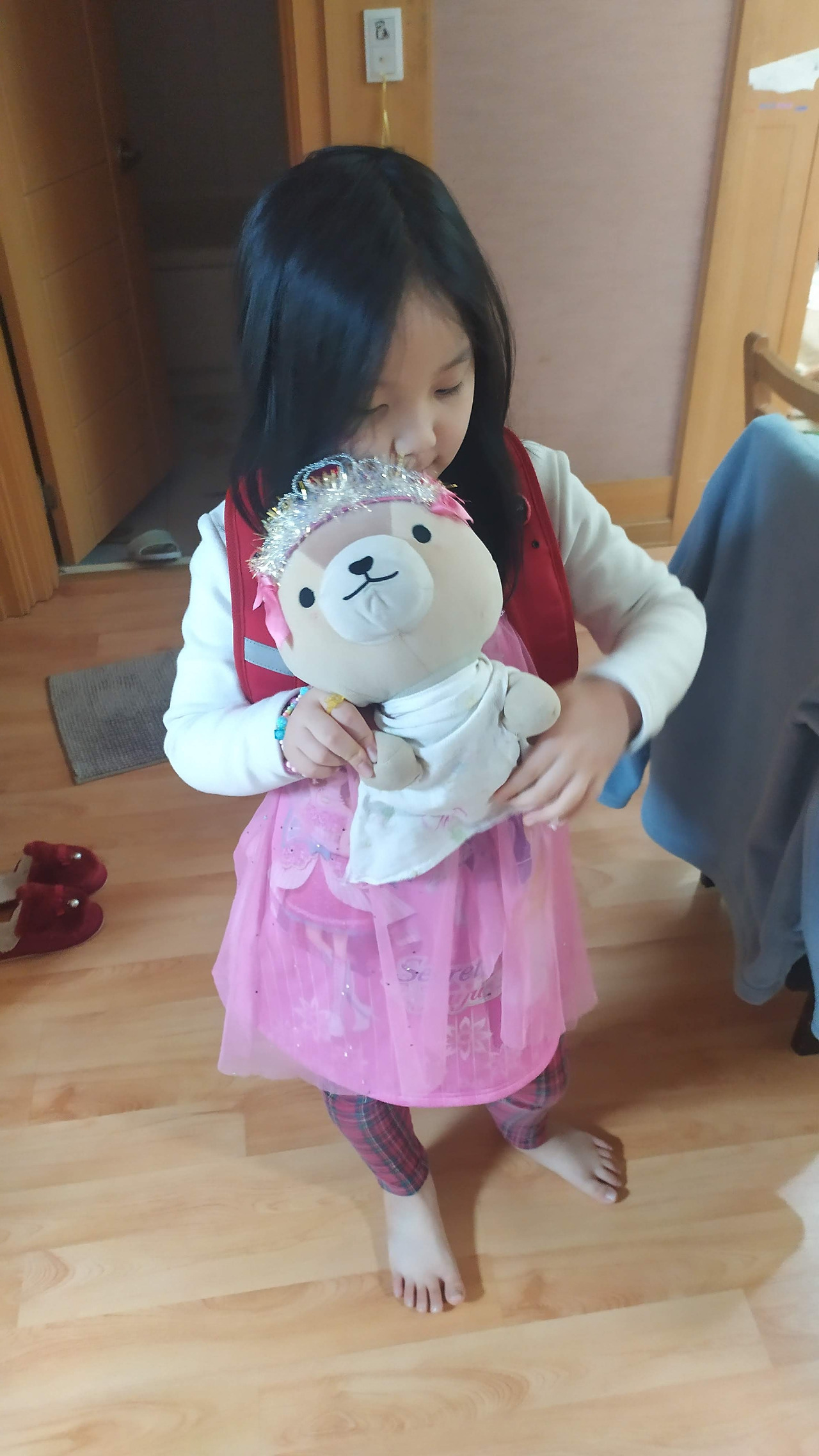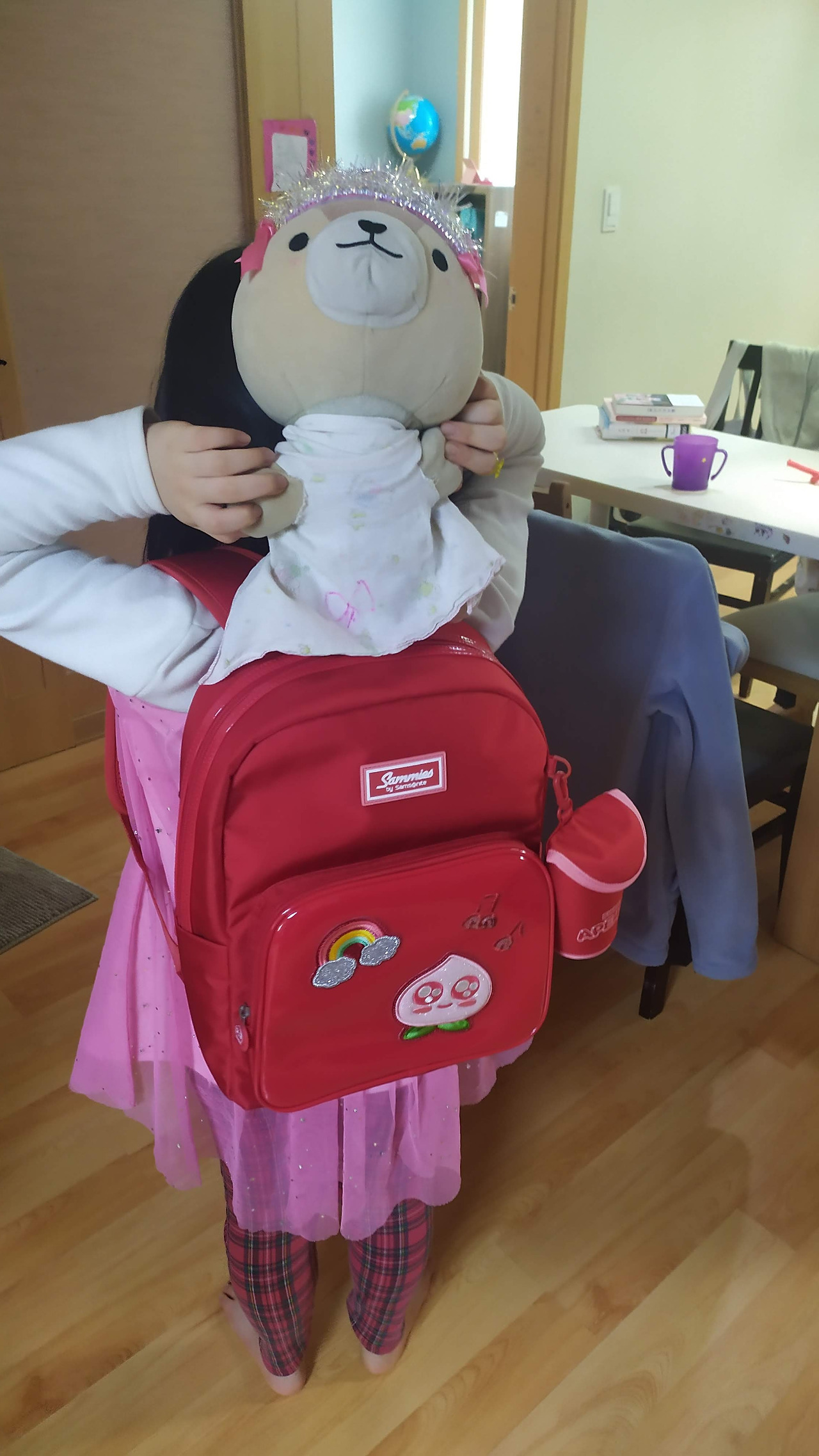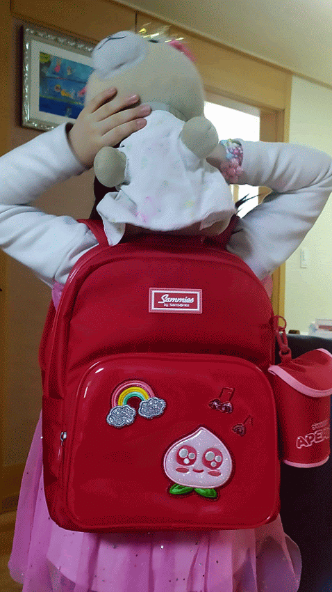 핑크색 '어피치'와 가방의 유광 빨간색이 잘 어울린다. 아이는 아끼는 다람쥐 인형 '라미'도 함께 등교하면 안되냐고 끈질기게 시위 중..