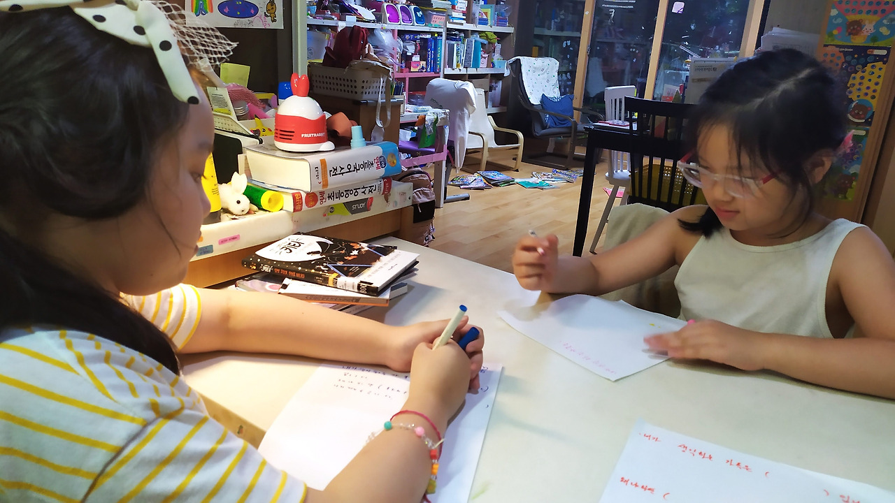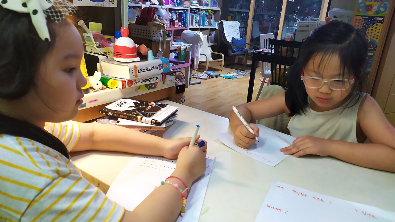 언니가 한 팔로 자신의 이면지를 가리고는 동생을 노려봅니다.