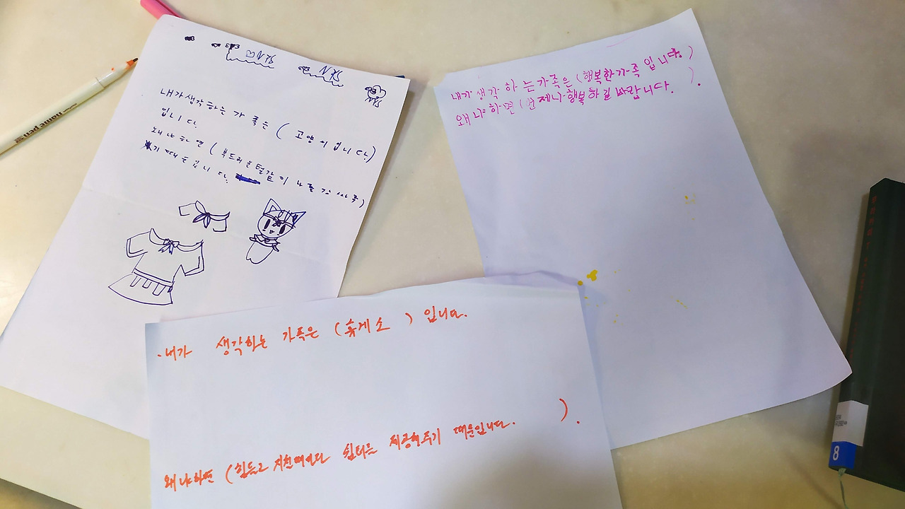 "여러 문장으로 써도 돼. 너희들이 그동안 생각해 온 가족의 참뜻에 대해 쓰면 된다."