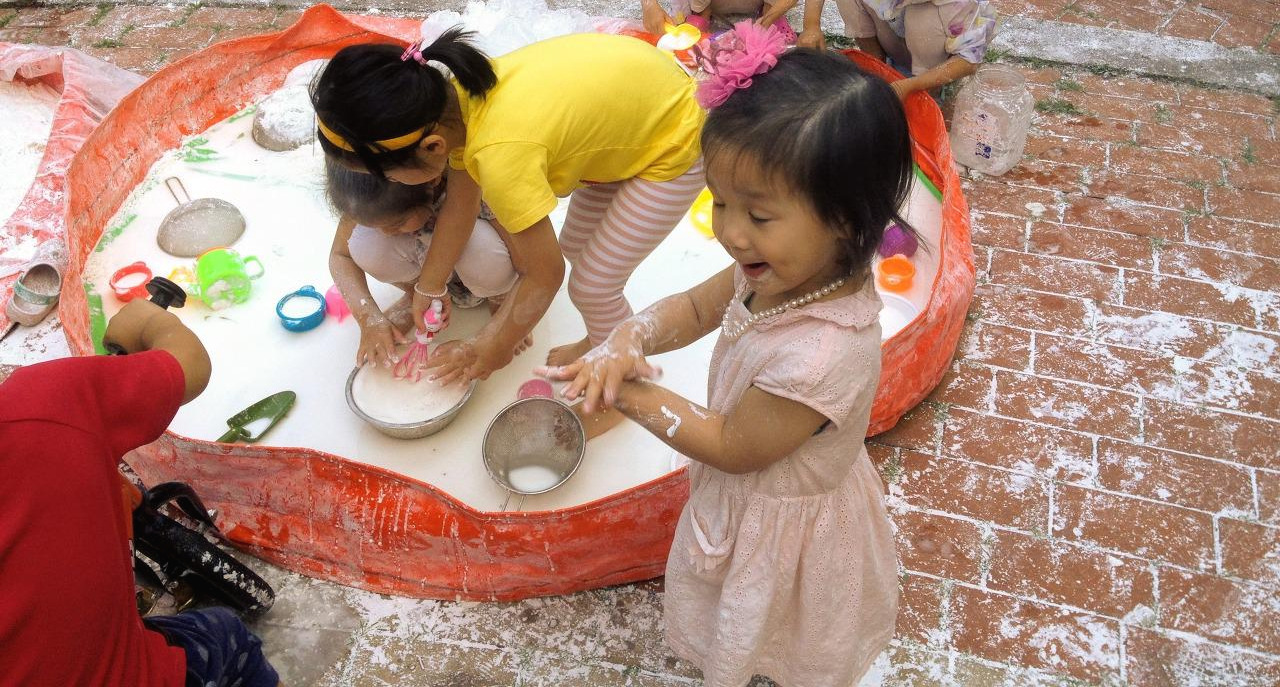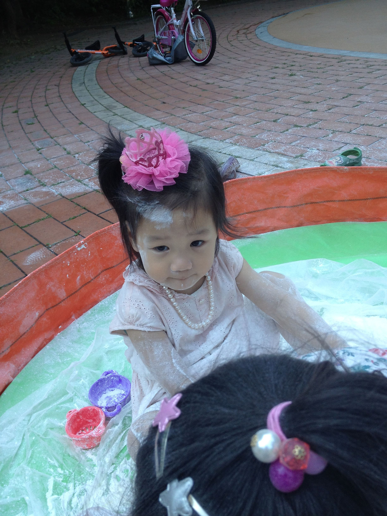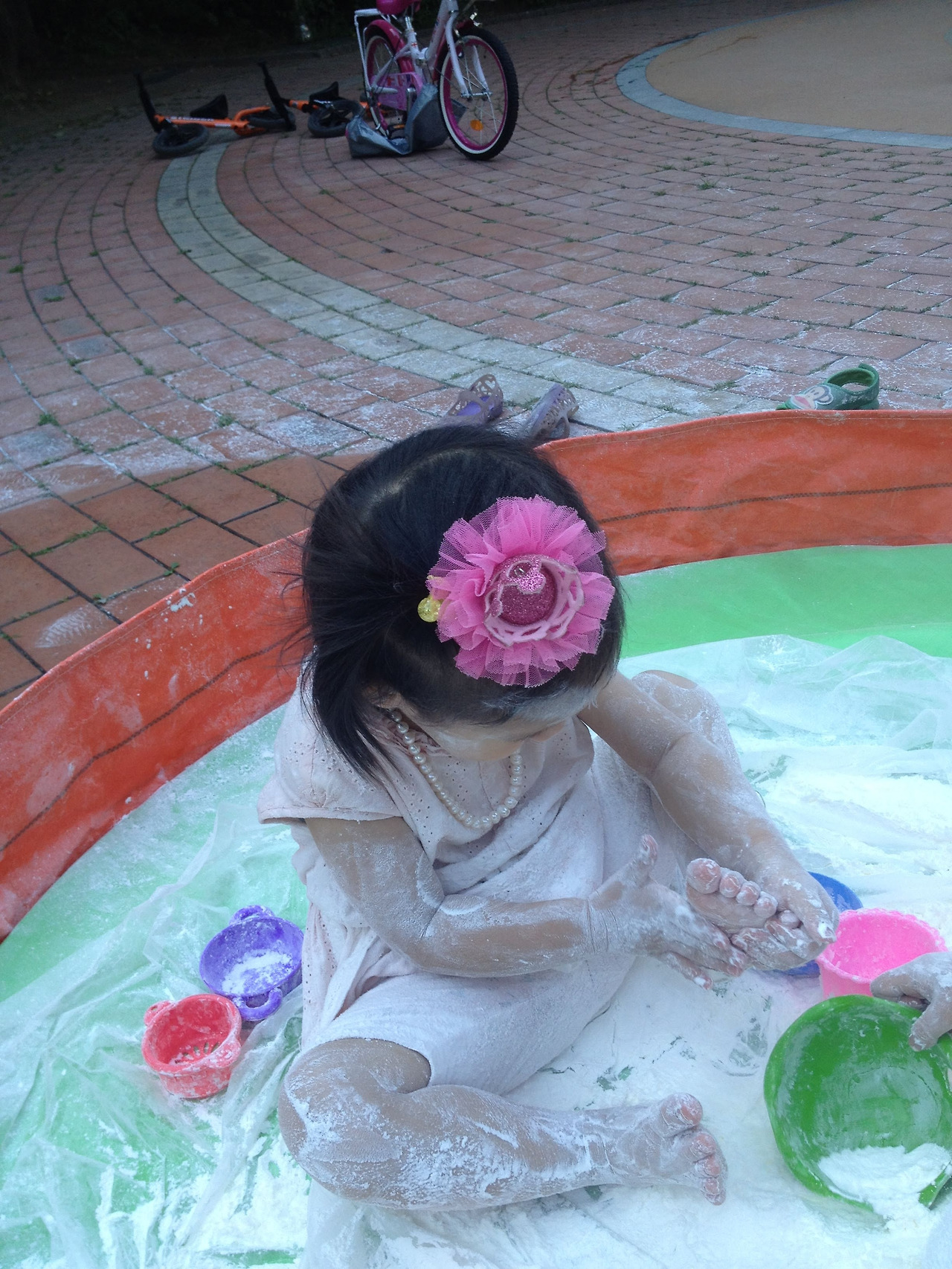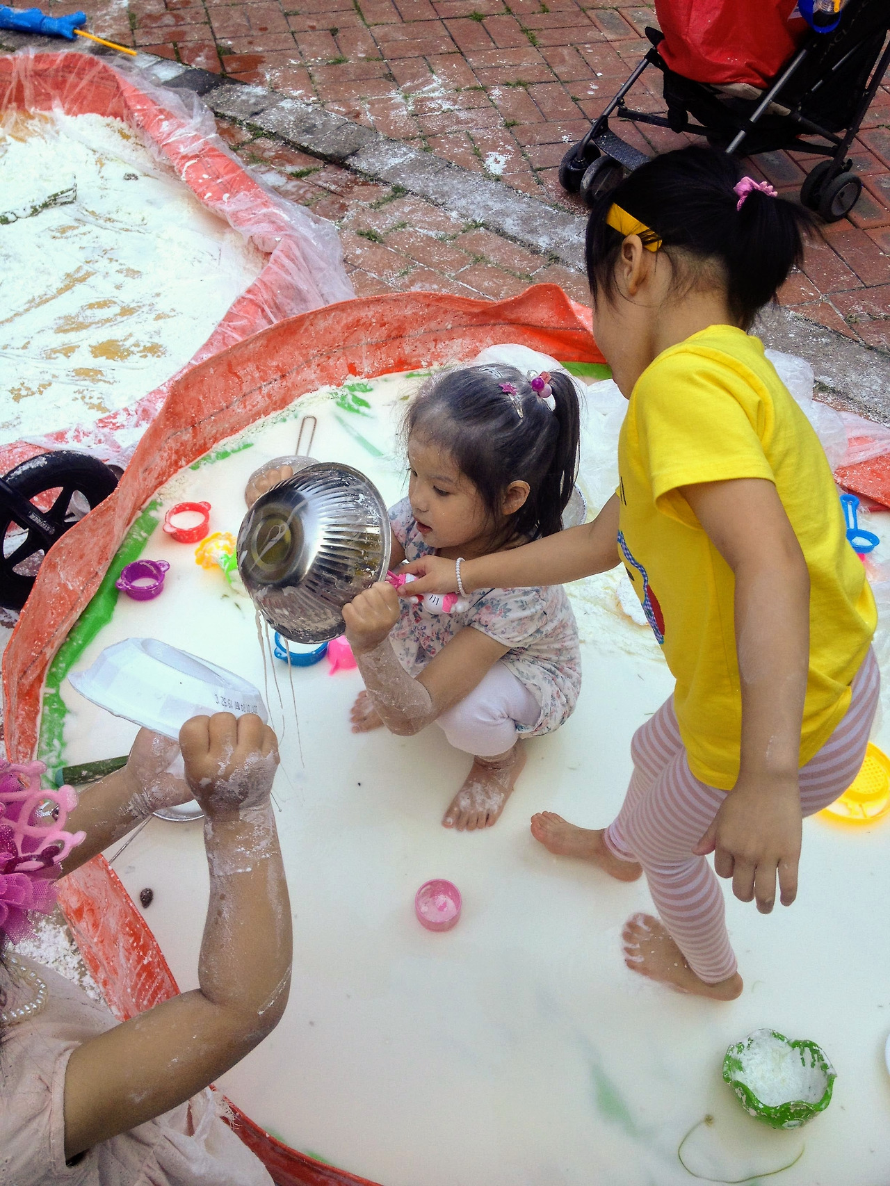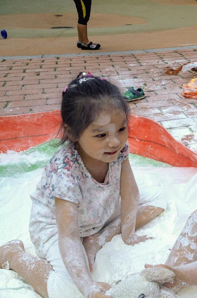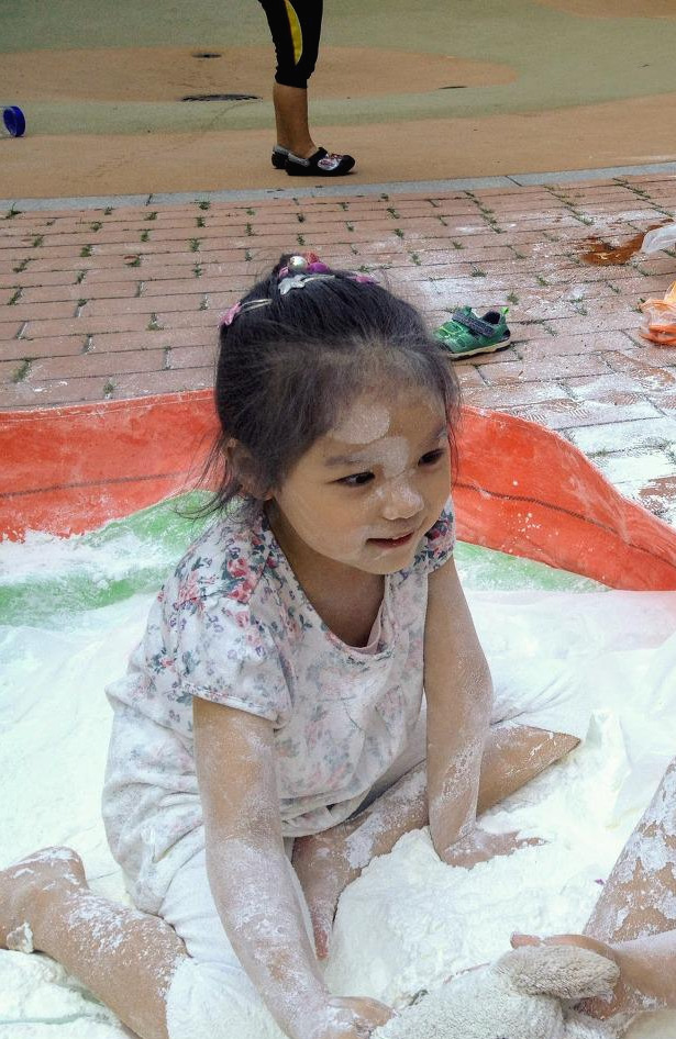 2016년 6월 25일. 오늘만큼 무더운 날. 가까운 공원에 솔이 친구의 엄마가 카트를 끌고 나타났다. 그 카트에는 묵직한 전분 한 포대가 실려 있었다. 그걸 뜯어서는 원형 간이 풀장 두엇에 나누어 흩어 놓았다. 거기에 근처 수돗가에서 공수한 물을 적당히 투입한다. 손으로 감싸 쥐어 올챙이 꼬리처럼 방울방울, 뚝뚝 흘러내릴 정도로 되직하게 전분 더미를 개어 놓으면 신나는 아이들 진탕 놀이터 오픈이다! 어린 솔과 연을 비롯한 아이들이 와아! 소리치며 풀장 안으로 뛰어들었다. 얼마 안가 아이들은 온몸에 전분 반죽을 뒤집어썼다. 흡사 목욕 후 바르는 베이비파우더 통을 실수로 터뜨린 것처럼, 거꾸로 뒤엎은 것처럼. 금세 아이들의 얼굴은 허예졌다. 세 살배기 연은 쭈그려 앉아 전분 범벅을 발바닥에 덕지덕지 바르더니 그 냄새를 맡기까지 했다. 솔은 아끼는 토끼 인형 '토토'를 가져와 진득거리는 풀장에서 함께 헤엄치고 물놀이하는 장난을 쳤다. 다른 친구들도 형형색색의 소꿉놀이 그릇에 모종삽, 양푼, 채반이며 거름망 등을 가져와서는 주변에 늘어놓았다. 아이들은 내 것, 니 것 따지지 않고 손에 잡히는 대로 하얀 반죽을 쓸어 담고, 조물딱 거리고 정성스레 다듬었다. 짓궂은 누군가는 자신의 얼굴에 묻히는 것도 모자라, 곁의 친구들 뺨에 허연 그림을 그리고 손가락 자욱을 남겼다. 아이들은 깔깔대며 웃었다. 그리 놀면서 시간 가는 줄 모르고 열중했다. 한낮의 무더위가 제법 선선해질 때까지 '전분 떡칠 놀이'를 마음껏 즐겼던 듯하다.