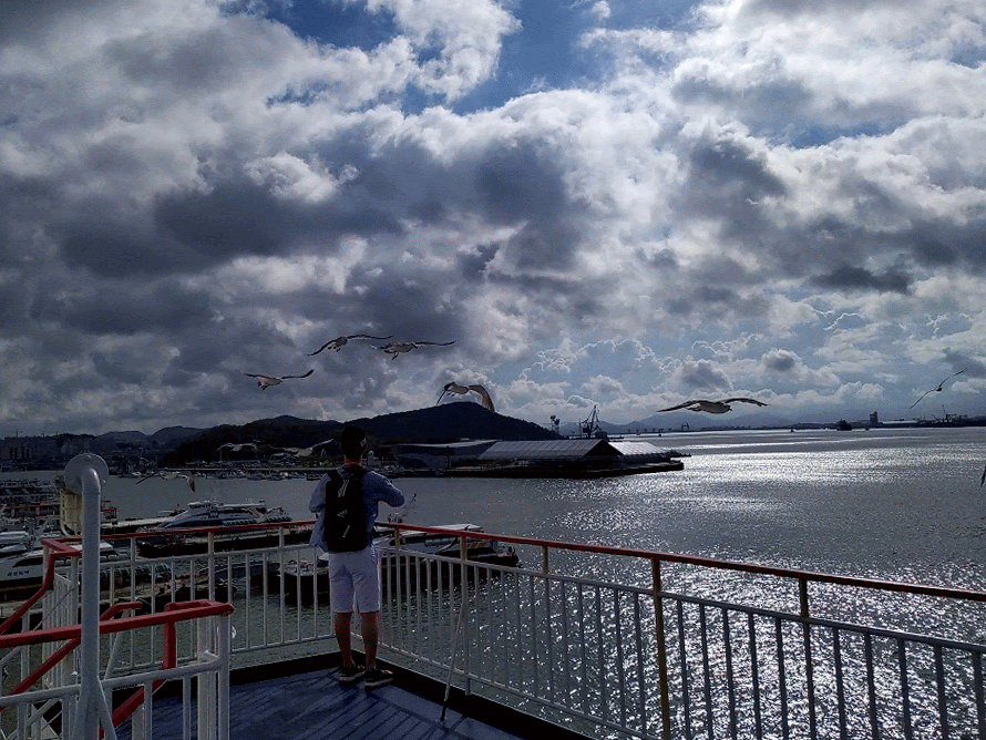 아이들은 배 안의 편의 시설에는 관심이 없다는 듯, 바닥에 떨어진 새우깡을 주워서는 곁에 머무르는 갈매기들에게 던져주기 바쁘다.