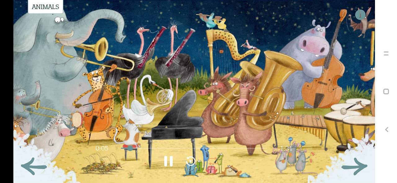 아이들과 함께 페이지를 넘기면서 동물들이 연주하는 다양한 음악을 듣다 보면, 최종장에 이르러 모든 동물들이 심포니를 이루어 대합주를 들려줍니다. 종이책에서는 반으로 접힌 지면을 활짝 열어젖히는 효과를 통해 별이 총총히 뜬 밤하늘과 바다를 배경으로 장대한 하모니를 들려주는 동물들의 모습을 한데 담았습니다.