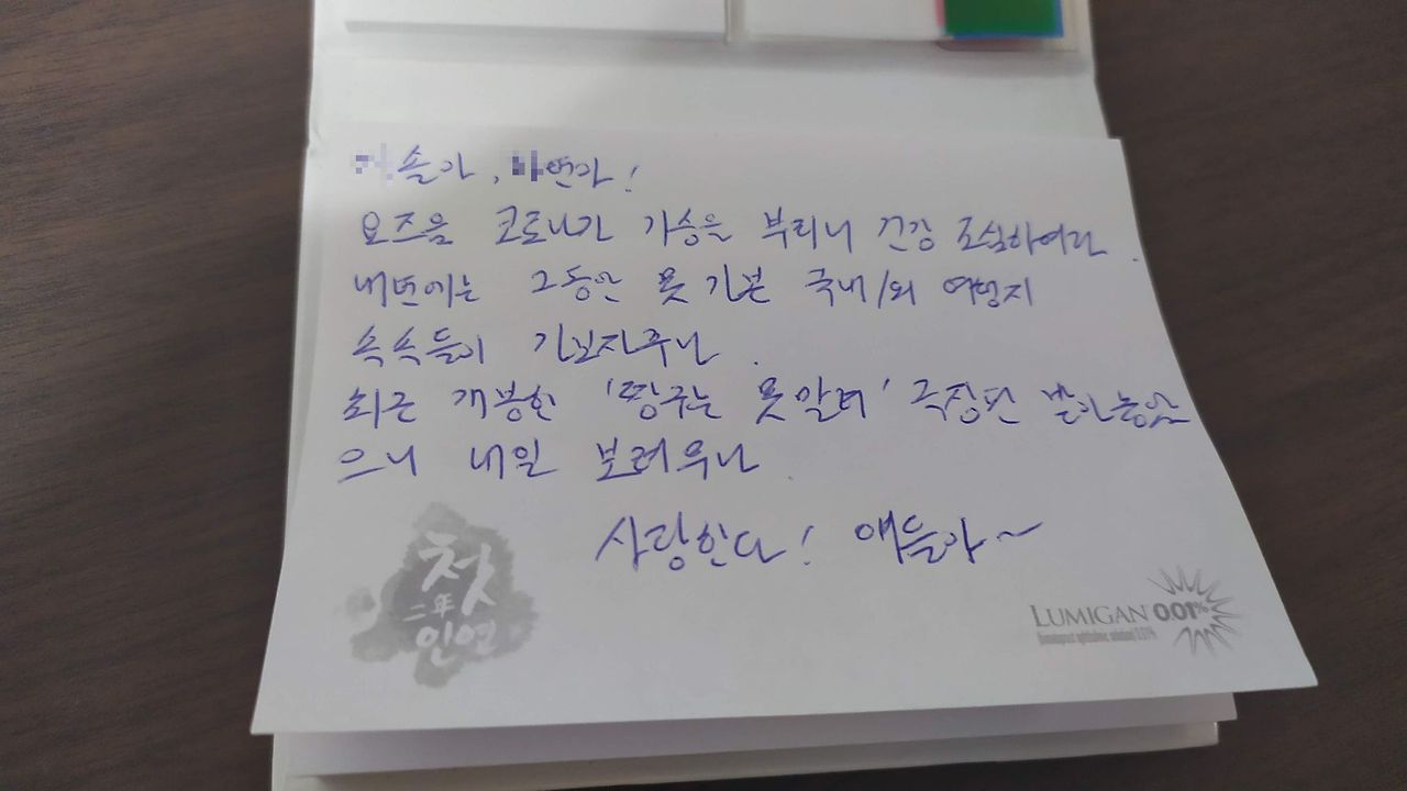 아이들에게 손편지를 써봅니다. 카톡 메시지는 보내려야 보낼 수 없네요. 아날로그적인 경험을 좀 더 쌓으라는 의미에서 아이들 몫의 휴대폰을 사주지 않았습니다. 시간이 흘러 어쩔 수 없이 폰을 사주더라도 당분간은 제 필적이 남는 손편지를 자주 쓸 듯합니다.