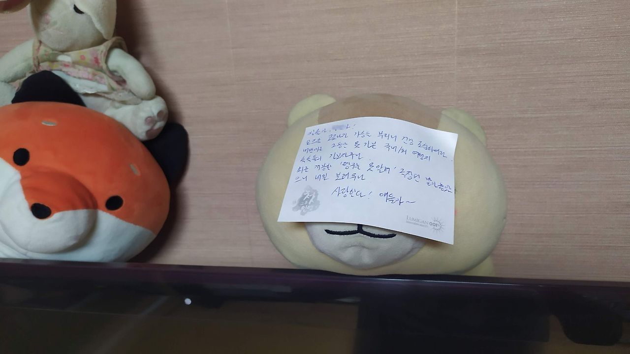 직접 전달하는 것은 재미가 없으니 아이들이 욕조에 들어가 목욕을 하고, 물놀이를 치는 틈을 타, 다람쥐 인형 '라미'의 얼굴에 턱 하니 붙여 놓습니다. 시원하게 목욕을 마치고 나온 아이들이 언젠가 제 손편지를 발견하곤 기뻐할 모습이 떠올라 저 혼자 입을 막고 킥킥 웃음을 흘립니다.