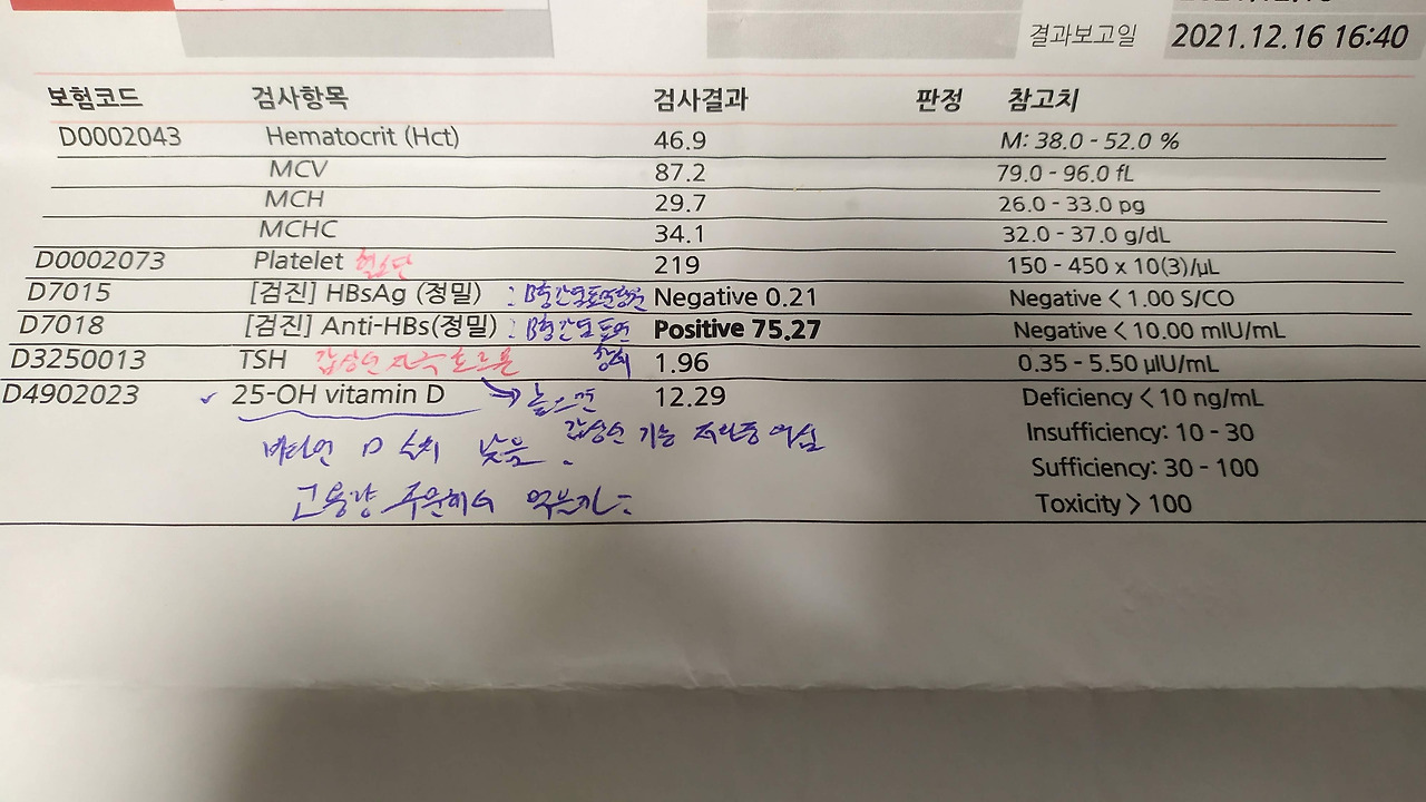 어찌했든 코로나 감염 이후 혈액 검사 결과지의 지표들은 비타민 D 수치를 제외하고는 모두 정상 범위였다.
