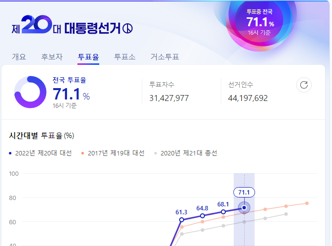 역대급 대선 투표율을 기록 중이다. 코로나만 아니었으면 최종 투표율 80% 돌파라는 진기록을 세웠을지도 모른다.