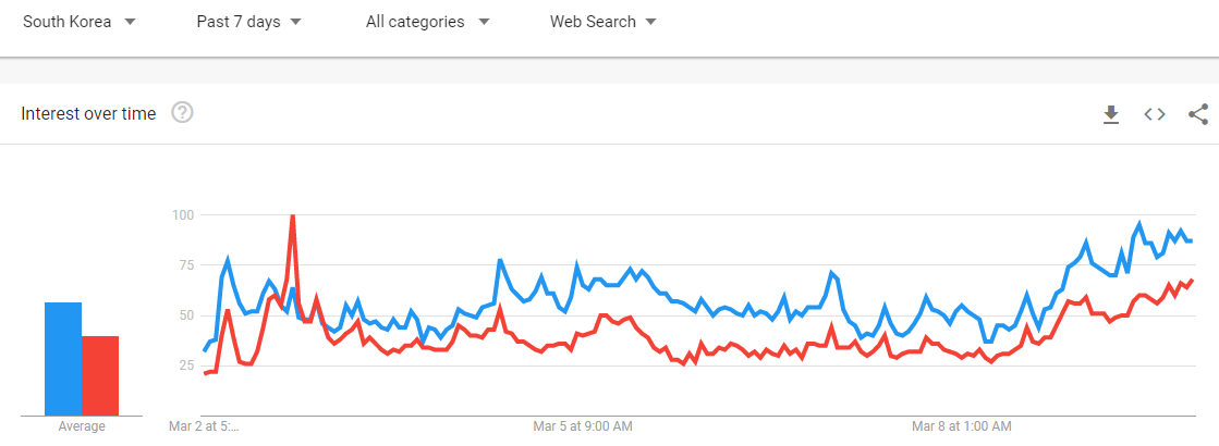 최근 7일 간 구글 웹 검색 유입량의 차이는 꽤 벌어져 있다. 최근 여론 조사 결과대로 근소한 표 차이로 패자는 분루를 삼켜야 하는 박빙의 승부가 펼쳐질지 아니면 구글 트렌드가 보여주는 대로 유세 기간 내내 끌려가던 어느 후보가 막판 골든 크로스를 통해 통쾌한 대역전승을 일궈낼지 귀추가 주목된다.