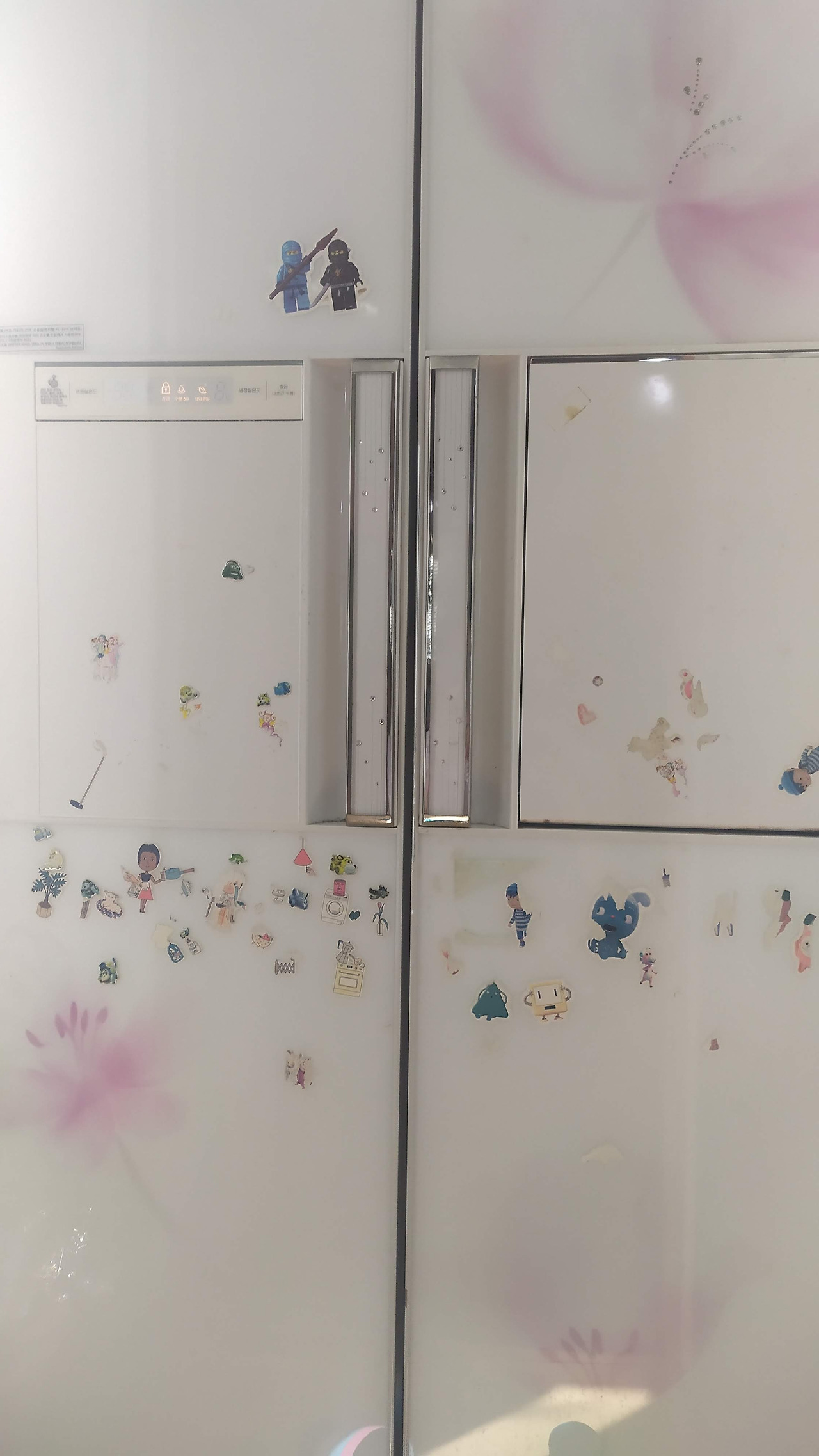 마지막으로 냉장고의 겉면을 광이 나도록 닦아 준다. 아이들이 붙여 놓은 온갖 스티커가 여기저기 붙어 있다.