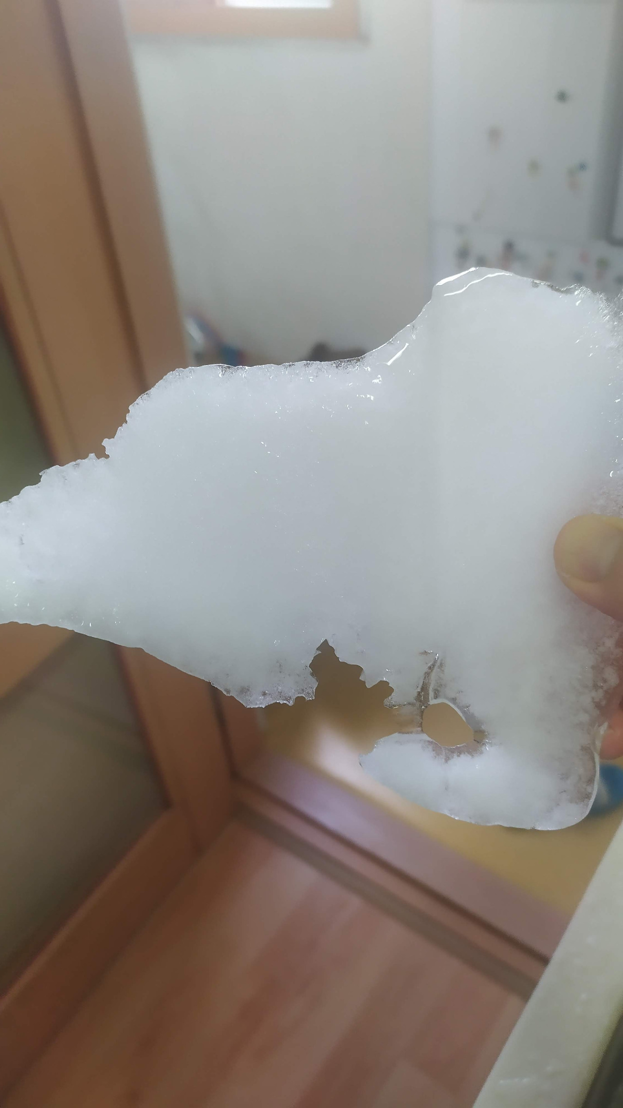 헤어드라이어와 드라이버를 양손에 들고 냉장고 앞에 앉아 빙설을 녹이고 쳐낸다. 냉장고 주위는 튀어나온 얼음 파편과 흥건한 물로 난장판이다. 틈틈이 주위를 닦아 정리한다. 함께 얼어붙은 탈취제는 녹으면서 내용물이 흘러나와 결국 버릴 수밖에 없었다. 작업한 지 30분 정도 지났을까?