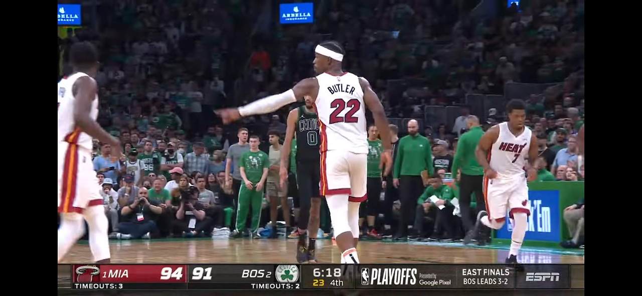 동부 컨퍼런스 파이널(ECF) 6차전. 시리즈 전적 3:2로 열세에 처한 팀을 구해야 하는 상황. 버틀러는 초반부터 전의를 다졌다. 내 외곽을 가리지 않고 터지는 그의 정확한 슛 터치는 절정에 달했다. 필드 골 성공률은 55.2%, 3점 슛은 8개 던져 그중 절반인 4개를 꽂았다. 그가 골밑 돌파를 시도할 때마다 보스턴의 수비는 겹겹으로 벽을 두르고 에워쌌지만 소용이 없었다. 중요한 승부처마다 터진 그의 앤드원은 광적인 응원으로 유명한 보스턴 홈 관중들의 고함을 일시에 잠재우기에 충분했다.