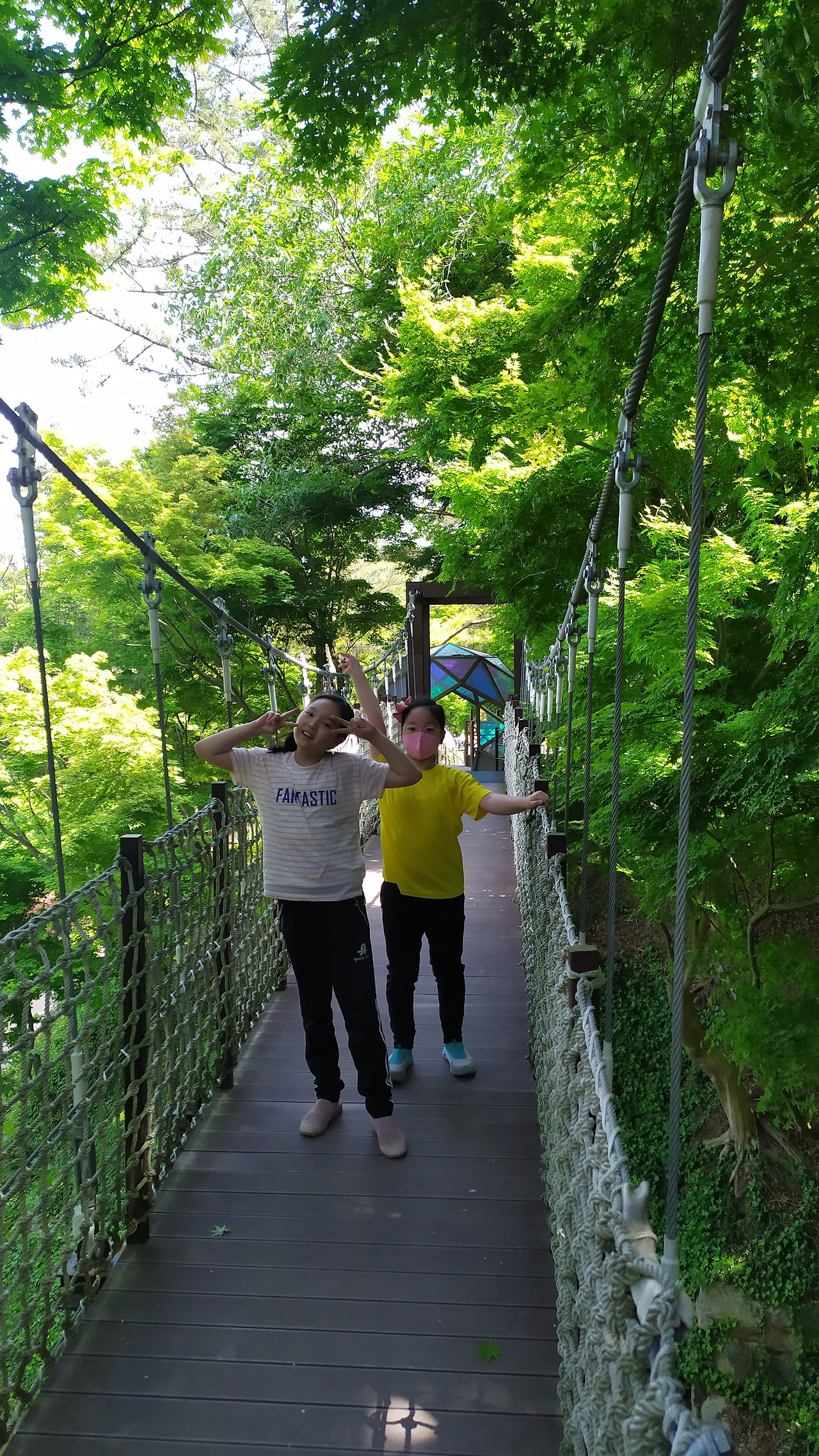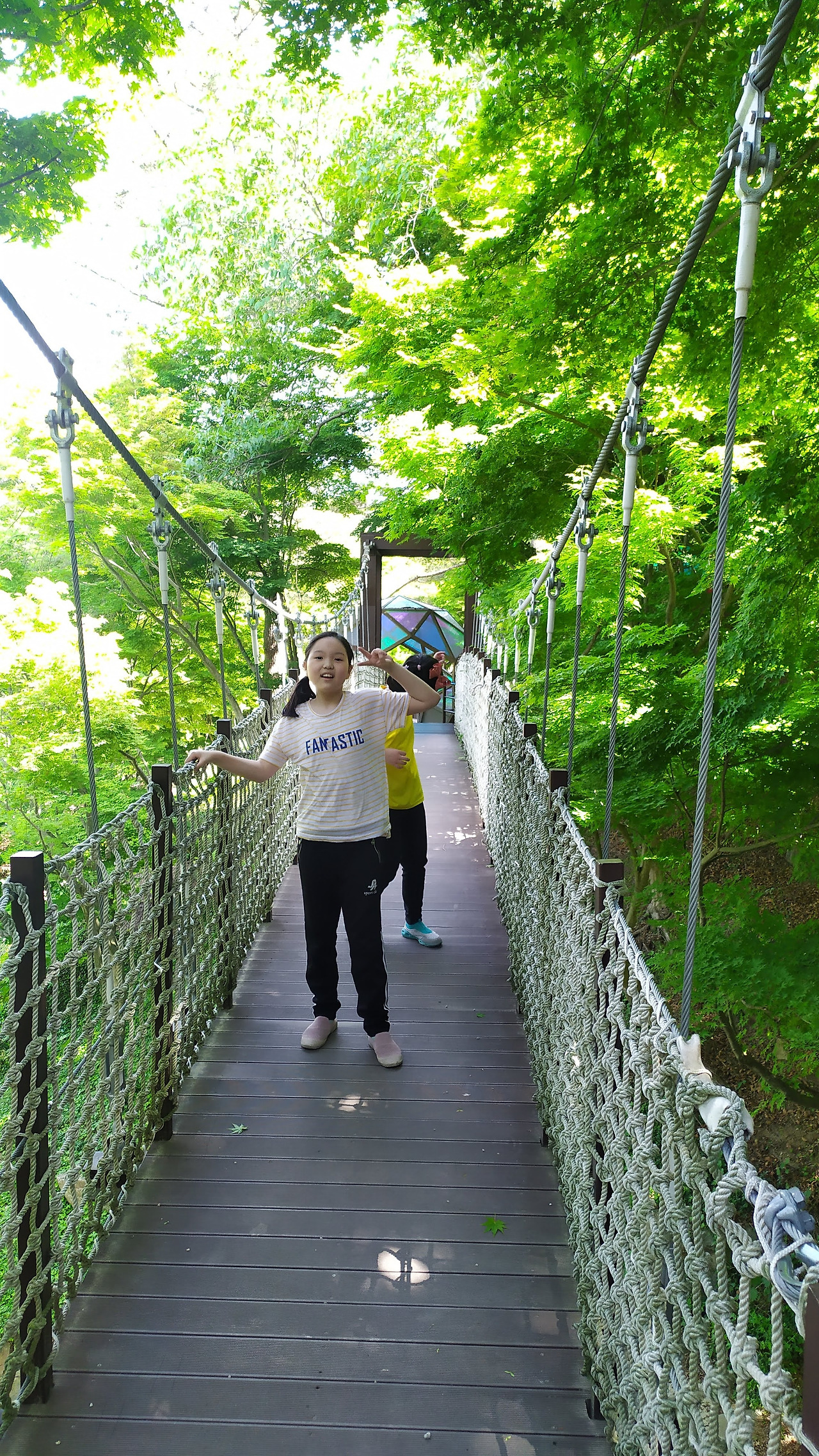 흔들 다리 주위를 감싼 짙은 녹음을 보라!