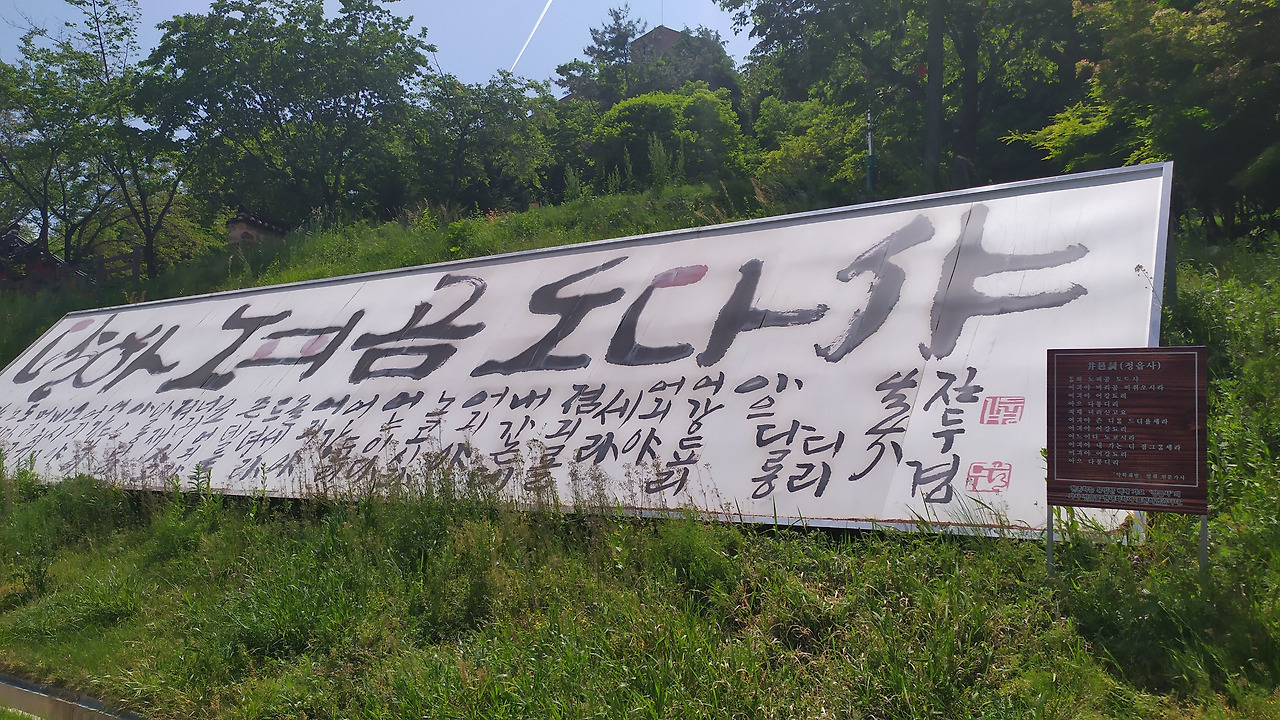 평지에 이르러 아이들에게 킥보드를 넘겨주었다. 아이들은 한쪽 발을 구르며 속도를 높인다. 겨우 숨을 돌리고 주위를 둘러본다. '정읍사 문화공원', 이름대로 정읍사를 대표하는 상징들이 곳곳에 배치되어 있다.