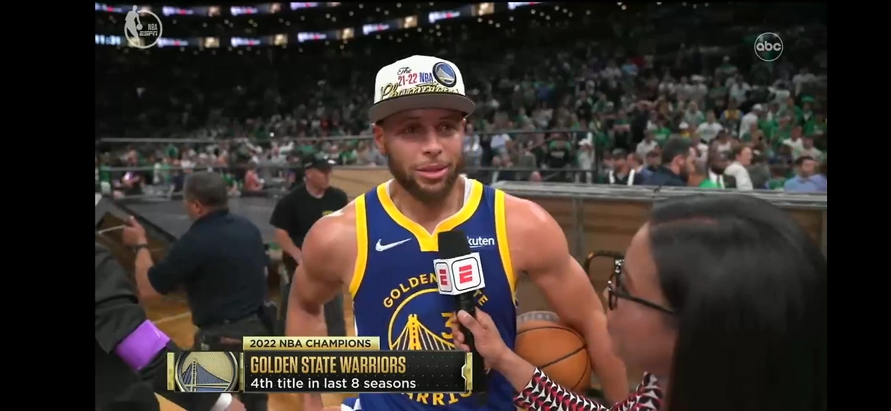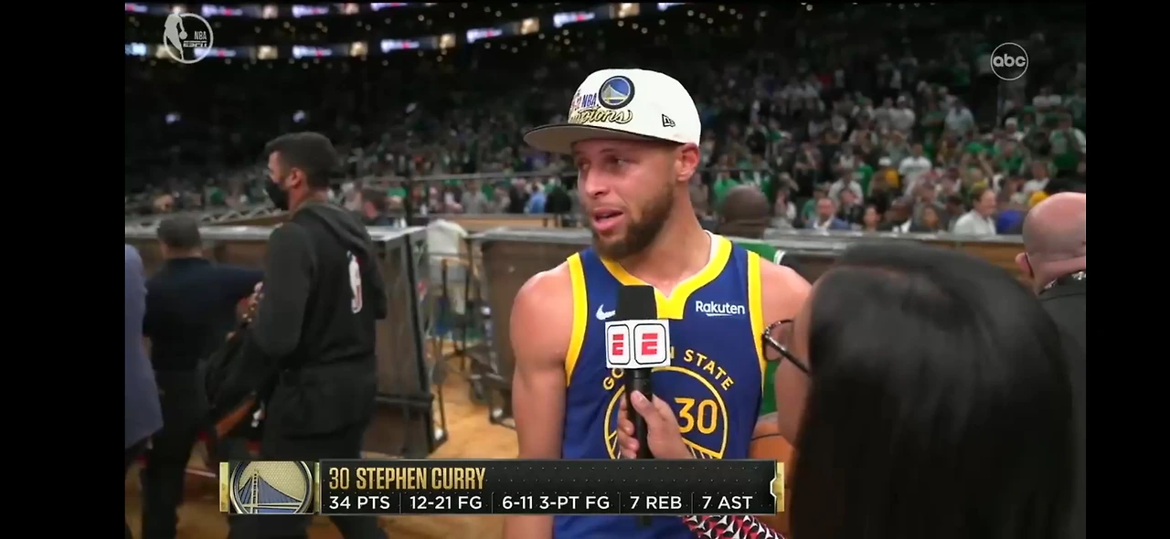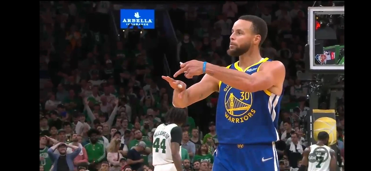 '스테판 커리'의 파이널 6차전 스탯이다. 지난 5차전에서 부진한 끝에 3점 슛 연속 경기 기록을 경신하는데 실패한 그는 보스턴 홈에서 내 외곽을 가리지 않고 골대를 폭격했다. 상대의 기세가 오를 때마다 찬물 샷을 터뜨리며 적지에서 특유의 골 세리머니를 선보였다. 경기 중반, 자신의 오른손 약지를 가리키며 "기필코 네 번째 우승 반지를 쟁취할 것이다! 바로 여기서.."라고 외치는 듯한 제스처는 두고두고 회자될 명장면이다.