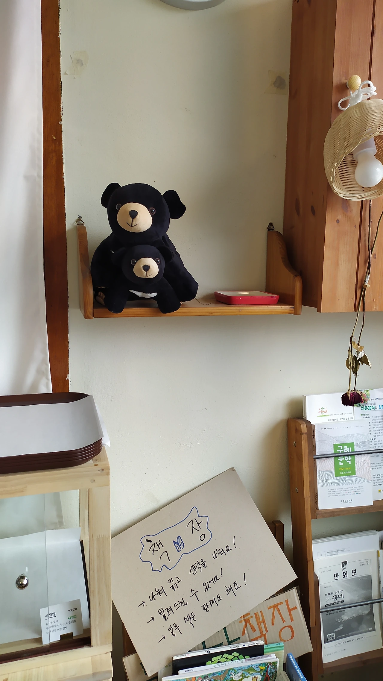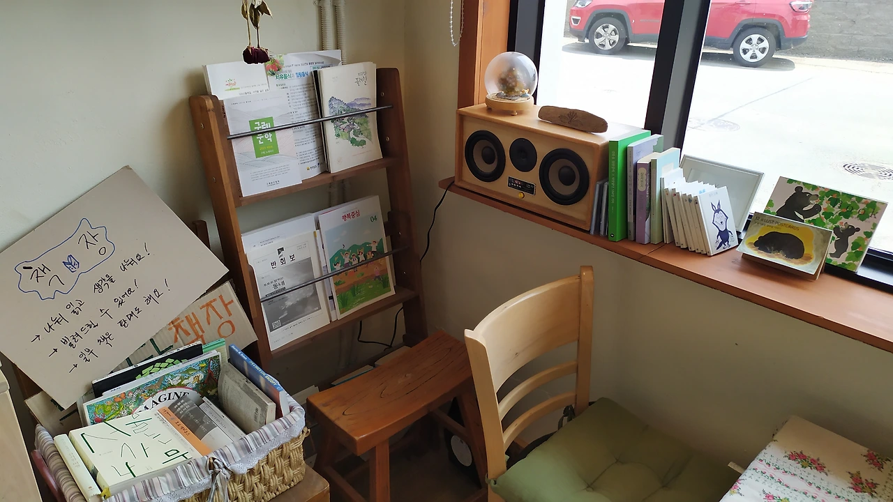 얼마 지나지 않아 테이블 위는 깨끗이 비워지고, 점점이 흘린 빵 지스러기만이 남았다. 그제야 알록달록한 꽃무리를 수놓은, 반듯한 테이블 보가 눈에 들어왔다. 통창에 비친 풍경을 배경 삼아 놓인 화병의 꽃가지들이 미색을 띤다. 무릇 생각이 있는 이들에게 나누고 빌려 주겠다는, 대바구니를 메운 책등과 표지가 눈에 띈다. 누군가 손수 제작한 오디오 스피커에서 흐르는 잔잔한 음악이 부산한 마음을 가라앉힌다. 모름지기 이곳을 찾는 모든 이들이 '느긋한 마음'으로 머무르고 쉴 수 있도록, 여러 모로 신경을 쓴 흔적이 역력하다.