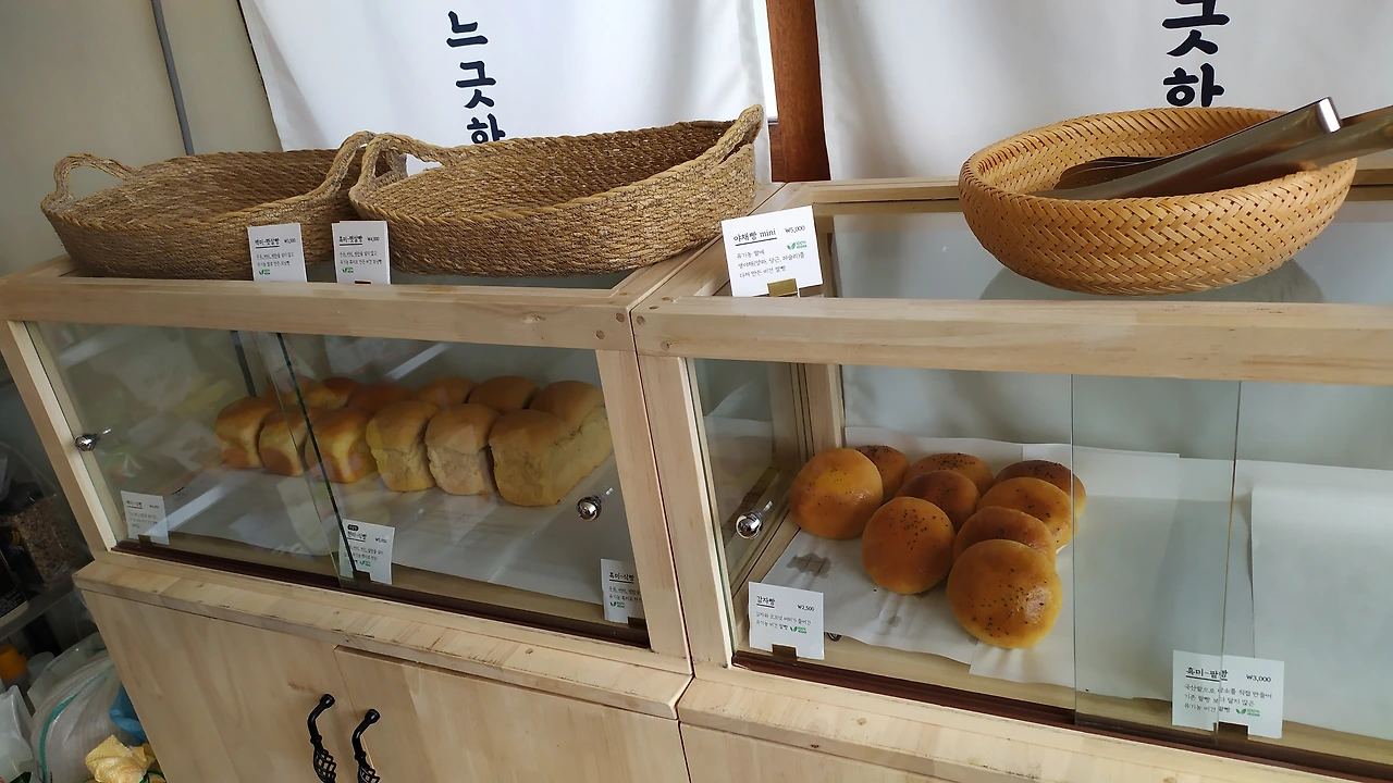 정갈한 조리복을 갖춘 이모님들이 주방에서 분주히 움직이며 빵을 굽고 있다. 감자 빵, 햇살 빵, 팥빵, 야채빵 그리고 백미/흑미/현미 식빵까지.. 오븐에서 막 구워져 나온, 봉긋하게 부푼 이 빵집의 대표 선수들이 사각 쟁반에 가지런히 놓인다. 그이들은 이 집을 찾는 단골손님들을 기다리며 뜸을 들인다. 향긋한 밥빵 내음을 풍기며 배고픈 이들을 유혹할 준비를 마쳤다.