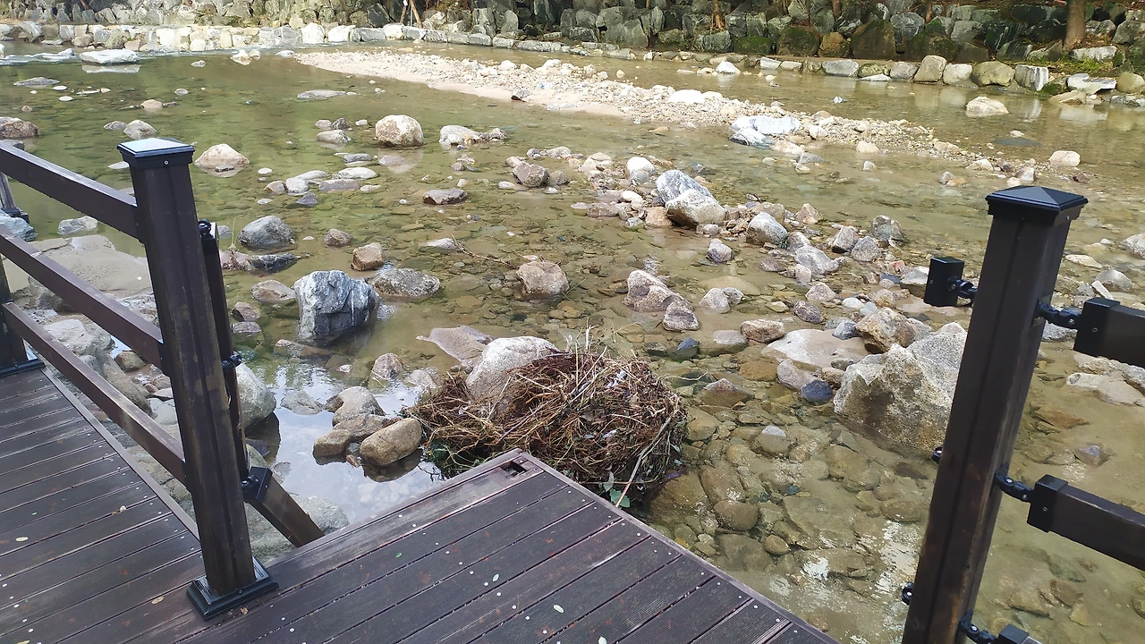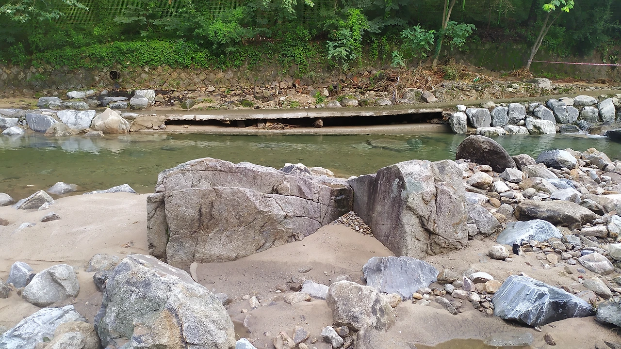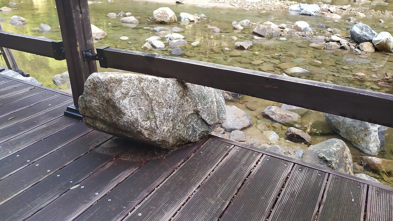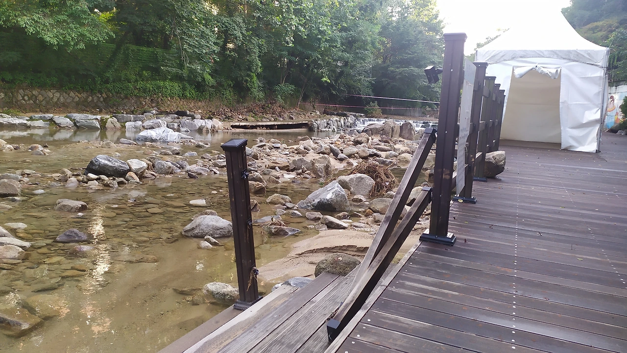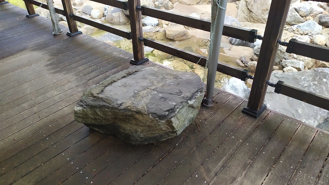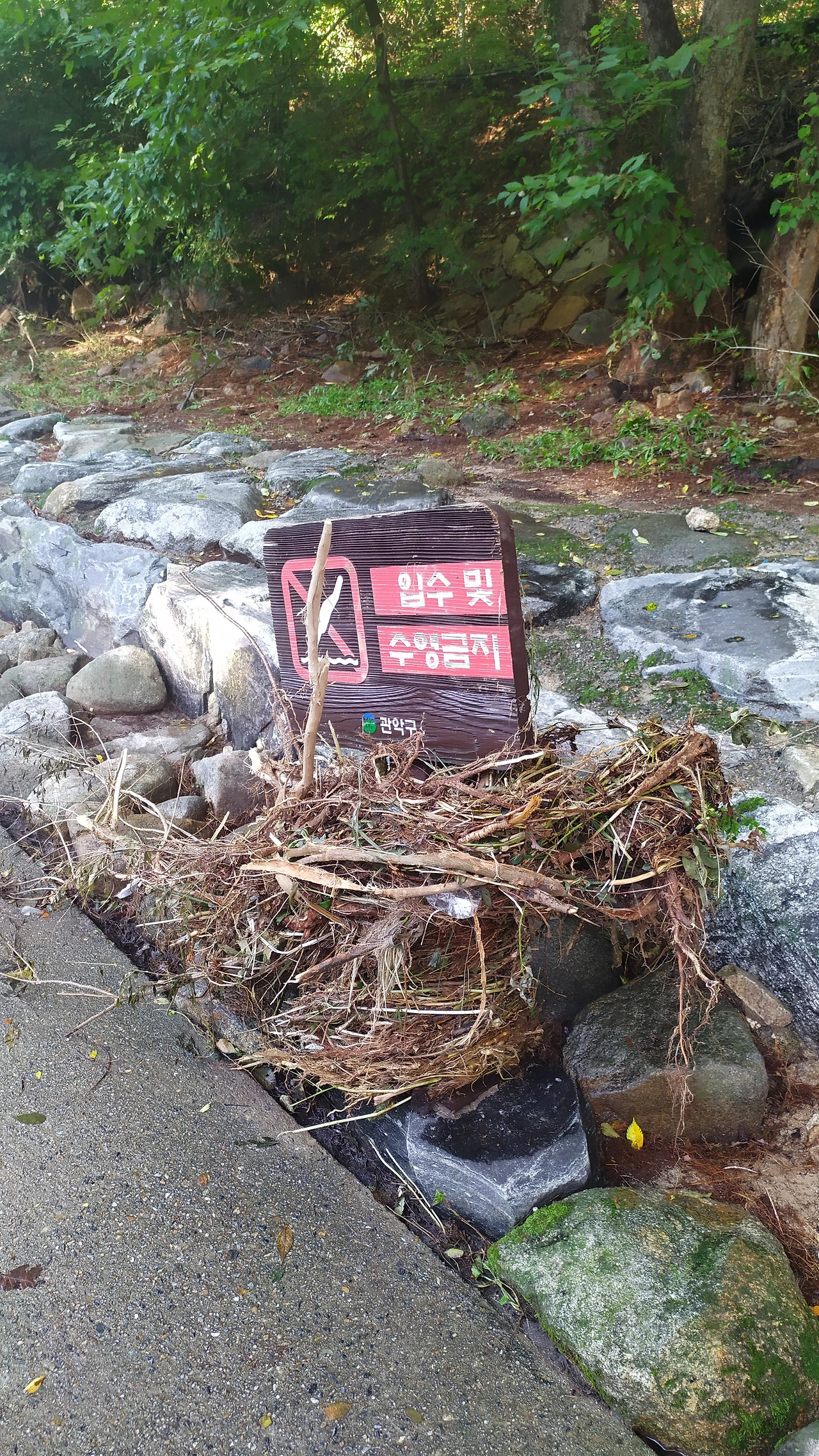 계곡 측면의 데크길에 들어서자 한눈에 보기에도 수량은 많이 줄어들었다. 한창 비가 쏟아질 때는 주변 산책로까지 황톳빛 물살이 삼켜버려 성난 바닷물을 방불케 했다. 물이 빠지자 수마가 할퀴고 간 참상이 여실히 드러났다. 장정 대여섯이 달려들어도 꿈쩍도 안 할 듯한, 육중한 암석 여럿이 제 자리가 아닌 엉뚱한 곳에서 뒹굴고 있는 게 아닌가. 난데없이 길을 떡하니 막아선, 웅크린 모난 바위가 눈에 띈다. 그중 몇몇은 콘크리트와 시멘트로 모서리와 틈을 처발라 땜질한 흔적이 뚜렷함에도, 거센 물살을 버티지 못하고 뿌리째 뽑혀 버렸다. 덕분에 가지런히 정비되었던 계곡 양편을 가로지르는 바윗길은 듬성듬성, 이가 빠지고 주저앉아 초토화되다시피 했다. 계류와 산책로를 가르던 목재 울타리는 사나흘 넘게 흘러 내뻗는, 폭발적인 수세水勢를 견디지 못하고 곳곳이 무너졌다. 그야말로 계곡은 격전을 치른 전쟁터와 다름없었다. 기록적인 폭우가 내린 탓에 견고하던 산과 계곡의 지형은 급격히 바뀌었다. 인간의 힘이 아닌, 자연재해로 지각 변동이 일어난 것이다.