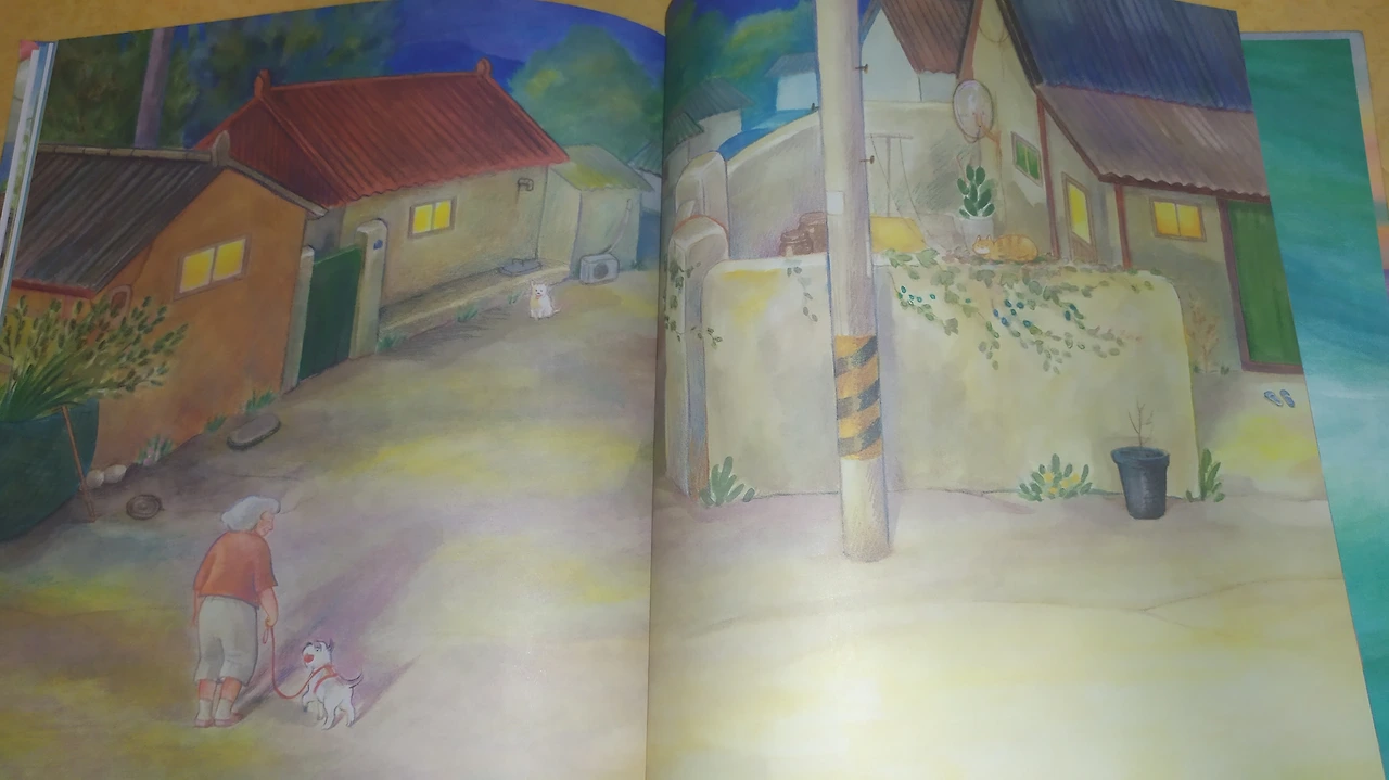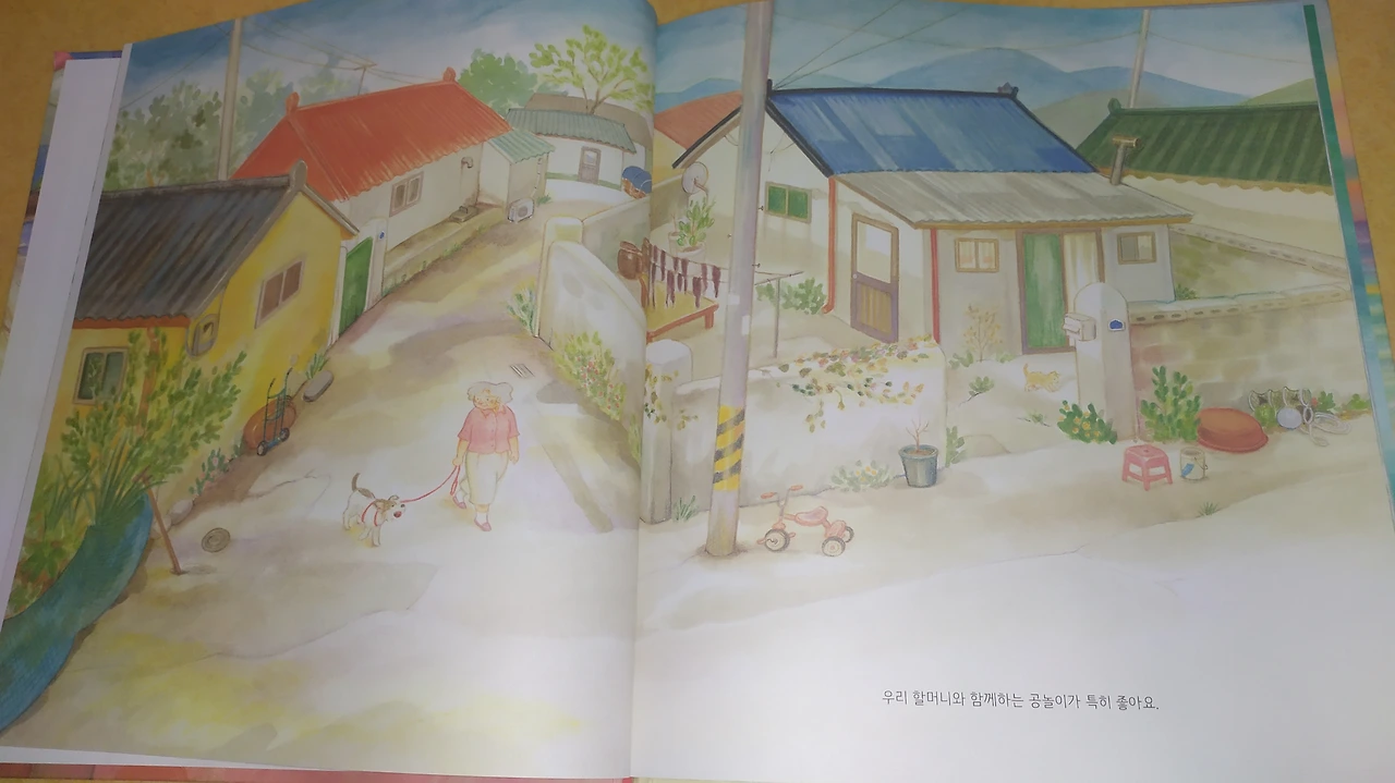 해변으로 향하는 굽이굽이 골목길이 정겹다. 이웃집 빨랫줄에는 오들오들한 미역이 줄지어 널려 있다. 문 밖에는 주인 없는 세발자전거와 고무 다라이, 어망이 나동그라져 있다. 대문짝을 아예 떼어낸 사이로 앞마당에서 뛰노는 아기 고양이가 눈에 띈다. 모두 연한 파스텔 톤의 따스한 색감으로 안온한 느낌을 전한다.
